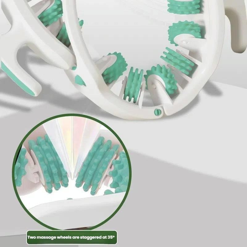 This product is a multi-functional leg massager designed for slimming, shaping, and warm-up exercises. It features soft rubber rollers arranged to provide effective kneading, wrapping, and squeezing for the legs. The device offers flexible massage coverage with removable bilateral handles, making it suitable for the whole body. Its skin-friendly material and wider handle ensure durability and comfort during use. The massage wheels are arranged at specific angles to help tighten and stretch muscles, promote blood circulation, and tighten skin. The adjustable width allows for a larger massage range and easy fitting for different leg sizes.