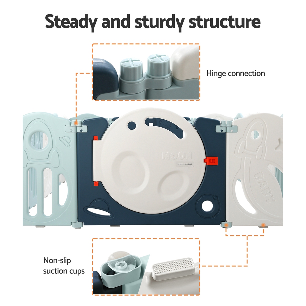 This baby playpen provides a safe and flexible space for children to play and stay secure. Made from child-safe, non-toxic HDPE material, it features a foldable design with 16 panels that can be arranged in various configurations. The playpen has a height of 63cm to prevent children from crawling out, and includes safety features such as a lockable door and anti-slip suction cups for stability. It is easy to assemble, fold, and store, making it convenient for parents to use both at home and on the go.