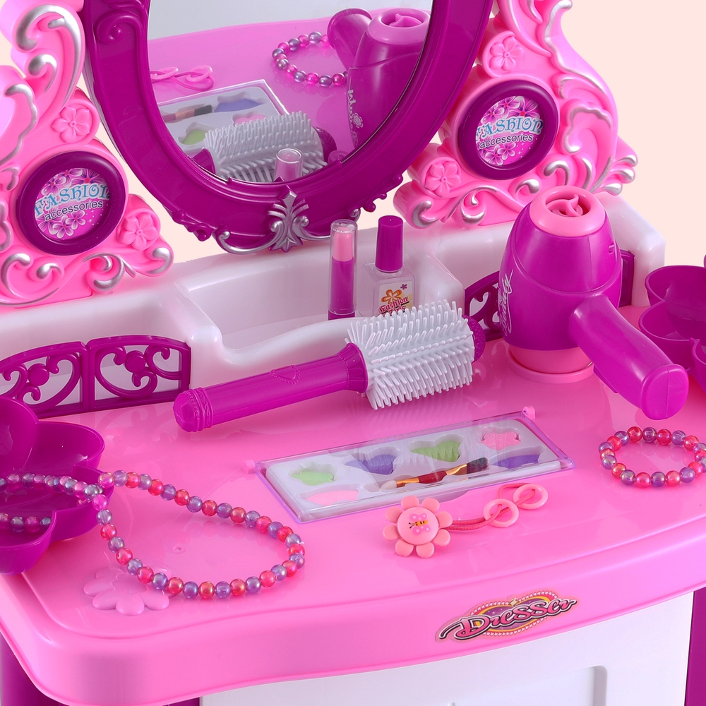 Encourage imaginative play with this pretend makeup and dressing table set designed for children. It provides a fun and creative way for kids to explore fashion and grooming activities, fostering their social and motor skills while offering an engaging play experience.