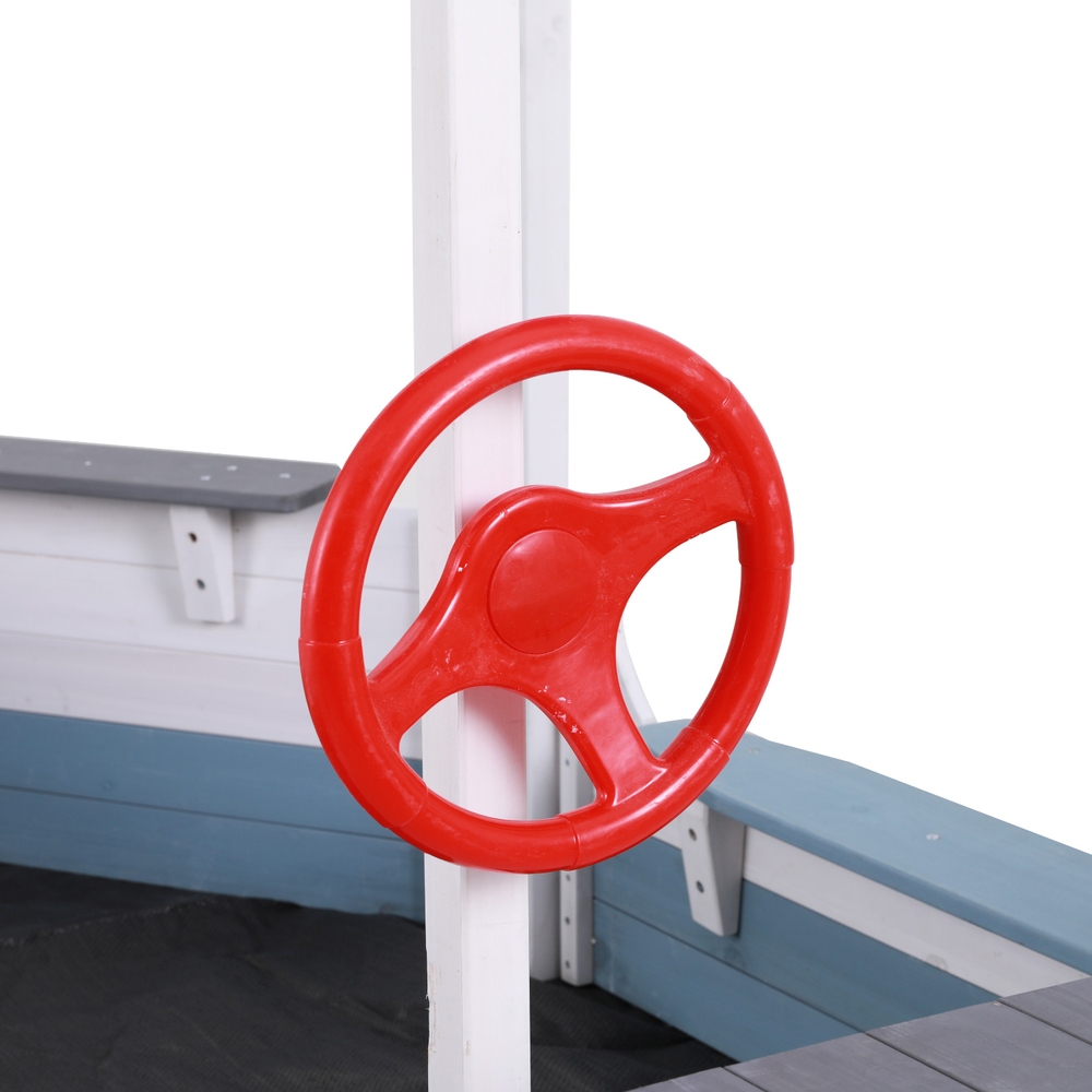 This boat-themed wooden sandpit provides a spacious and safe outdoor play area for children. It features a boat-shaped design with a flag and rudder, a UV-protected canopy, and a ground sheet. The sandpit is made from treated timber, ensuring durability and safety, with an easy-to-assemble structure suitable for young children to enjoy imaginative play.