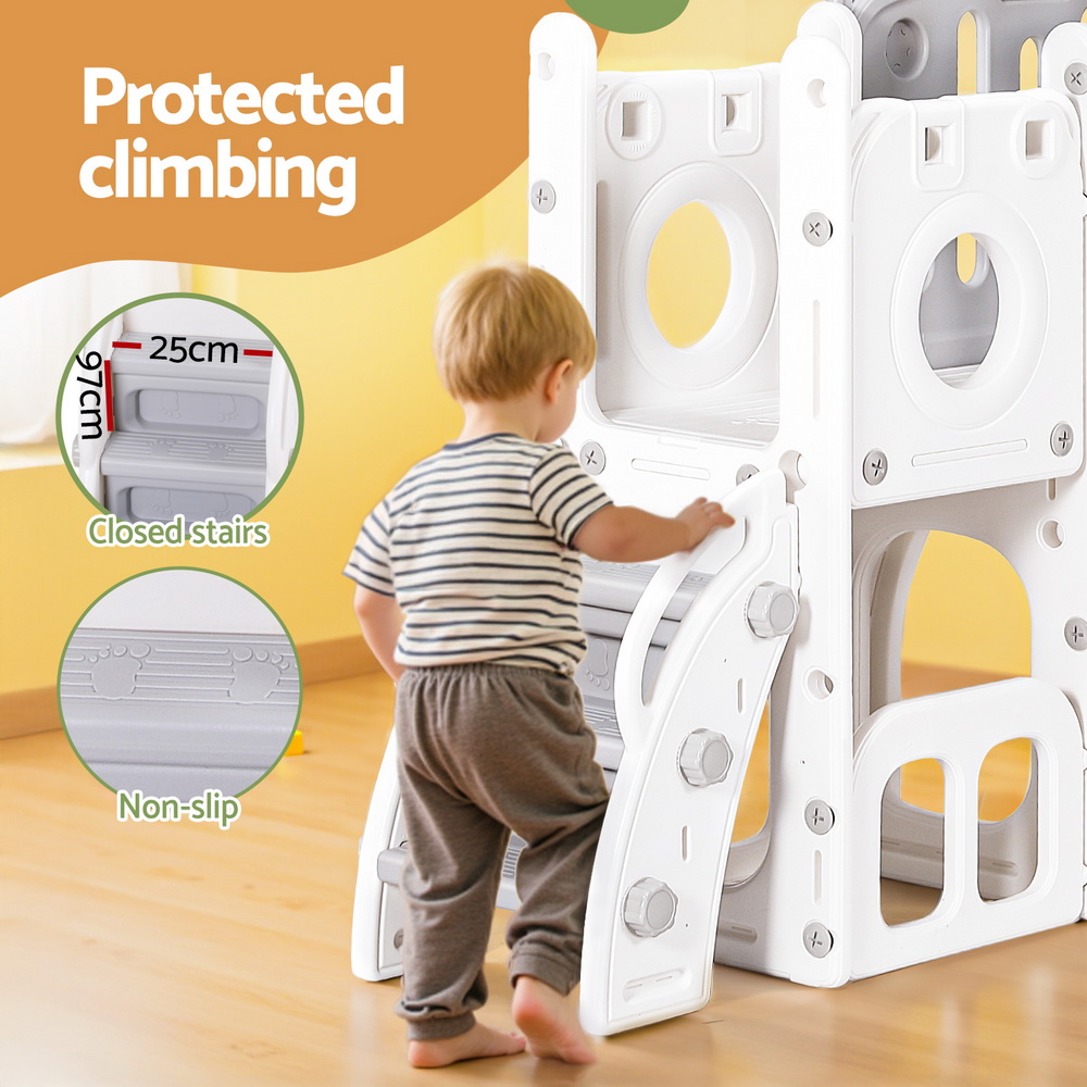 This 3-in-1 kids’ play set offers a versatile and engaging activity station suitable for both indoor and outdoor use. It features a wide platform, a fun telescope, and a dual ladder, providing multiple ways for children to play and explore. The design includes safety features such as anti-slip steps and safe grip handles, along with ample space at the bottom for toy storage. The set is made from durable HDPE material and is easy to assemble, making it a great addition to any play area.