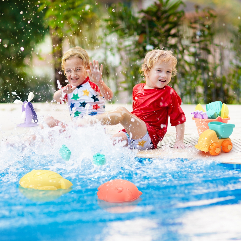 - 16-piece beach toy set including sand truck, windmill, bucket, and shovels