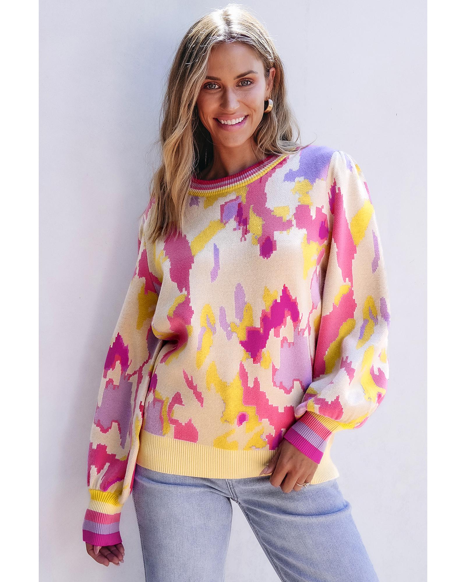 This sweater features a stylish abstract print with bold color blocking and dramatic balloon sleeves, creating a trendy and eye-catching look. It is designed to be versatile and pairs well with casual pants and skirts, making it suitable for various casual occasions.