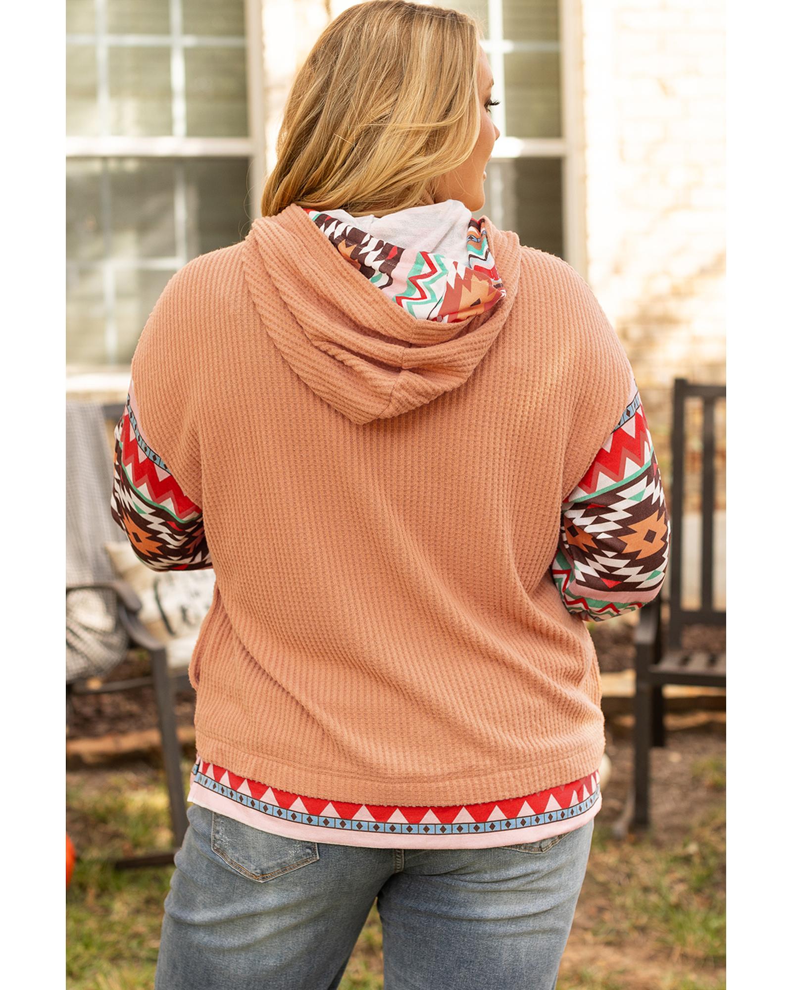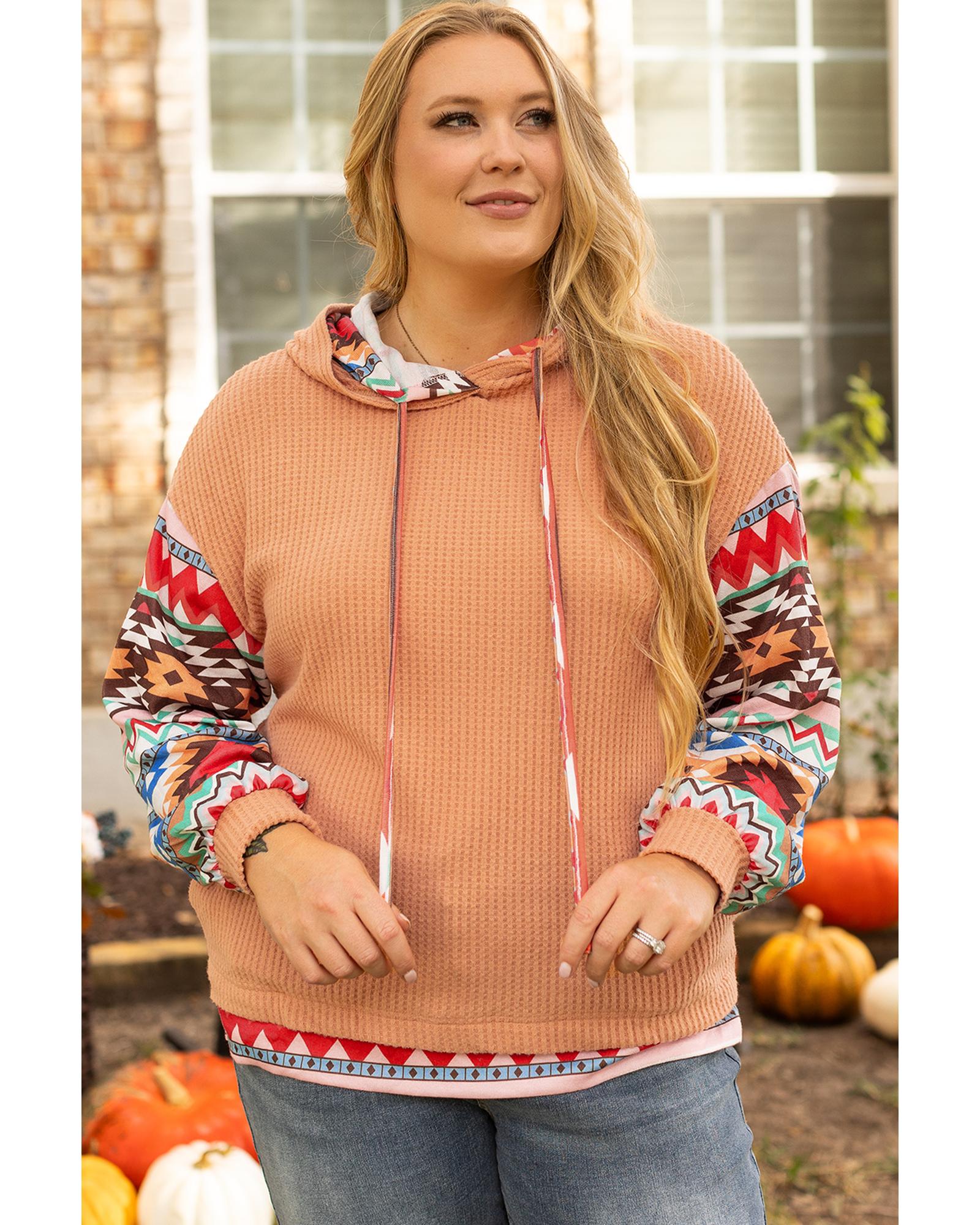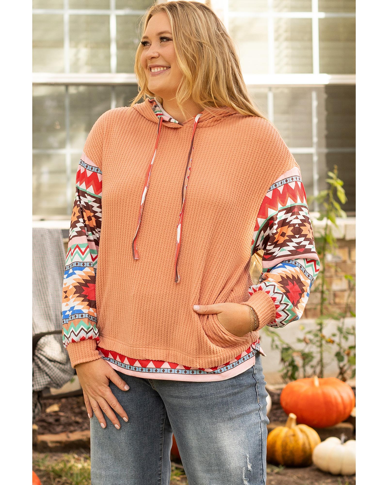 This plus size hoodie features a trendy fitted design with a unique Aztec patchwork pattern. Crafted from waffle knit fabric, it offers a textured feel and a comfortable fit suitable for casual and stylish looks. The hoodie includes functional details such as a drawstring hood and convenient side pockets, making it both fashionable and practical.