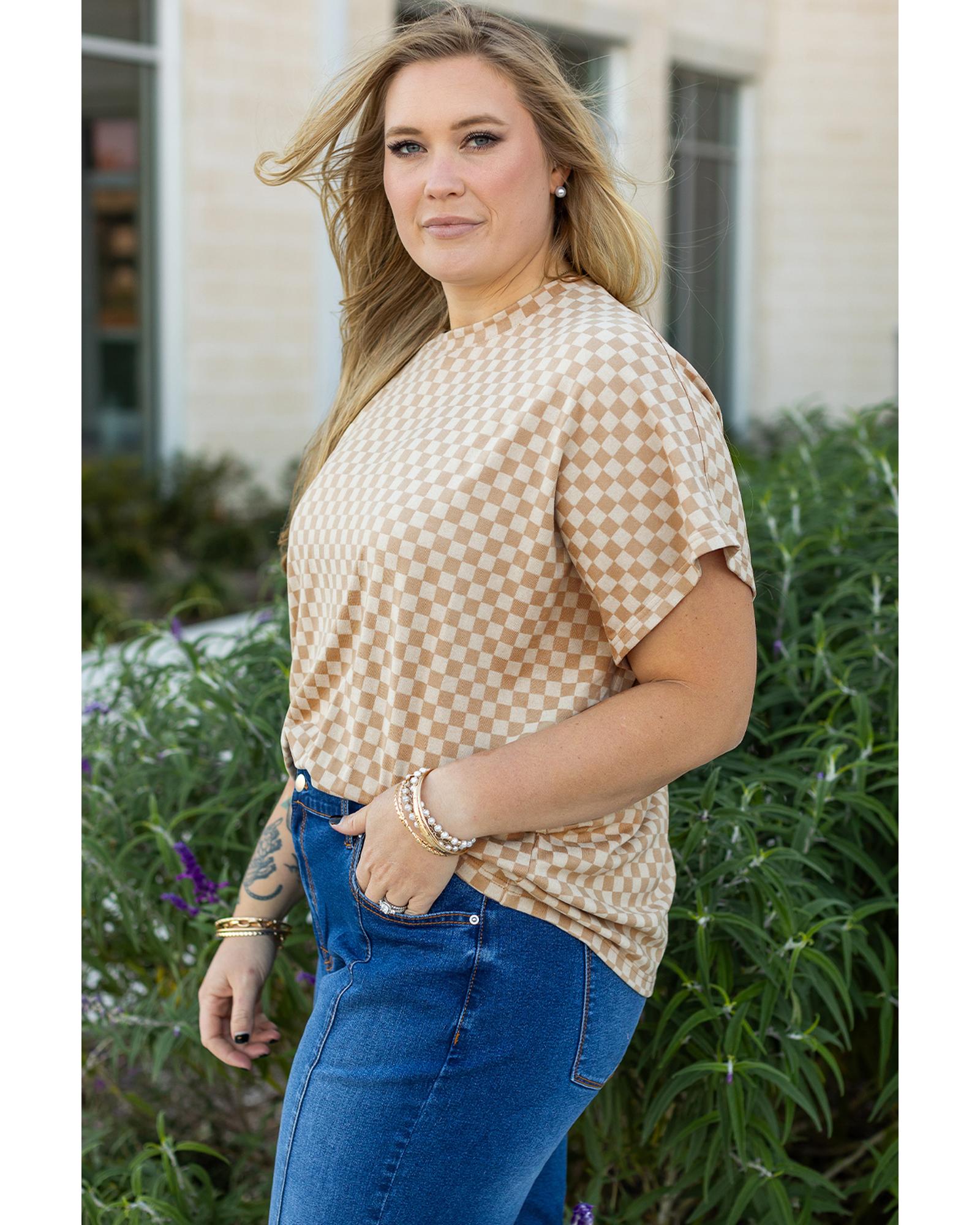 This stylish T-shirt features a classic khaki checkerboard pattern with a relaxed and comfortable fit. Designed with a trendy, fitted look, it is suitable for various casual occasions and offers a flattering plus size option.