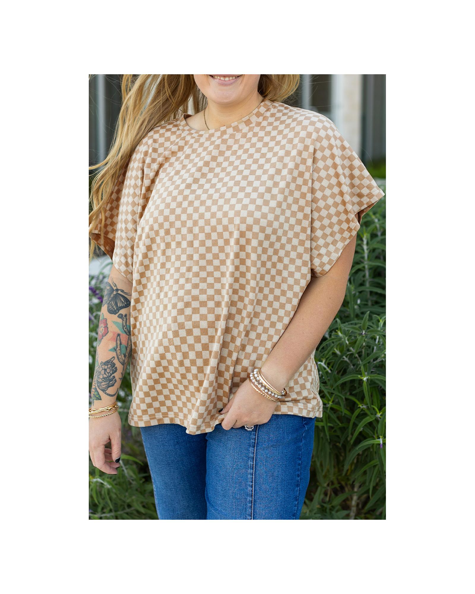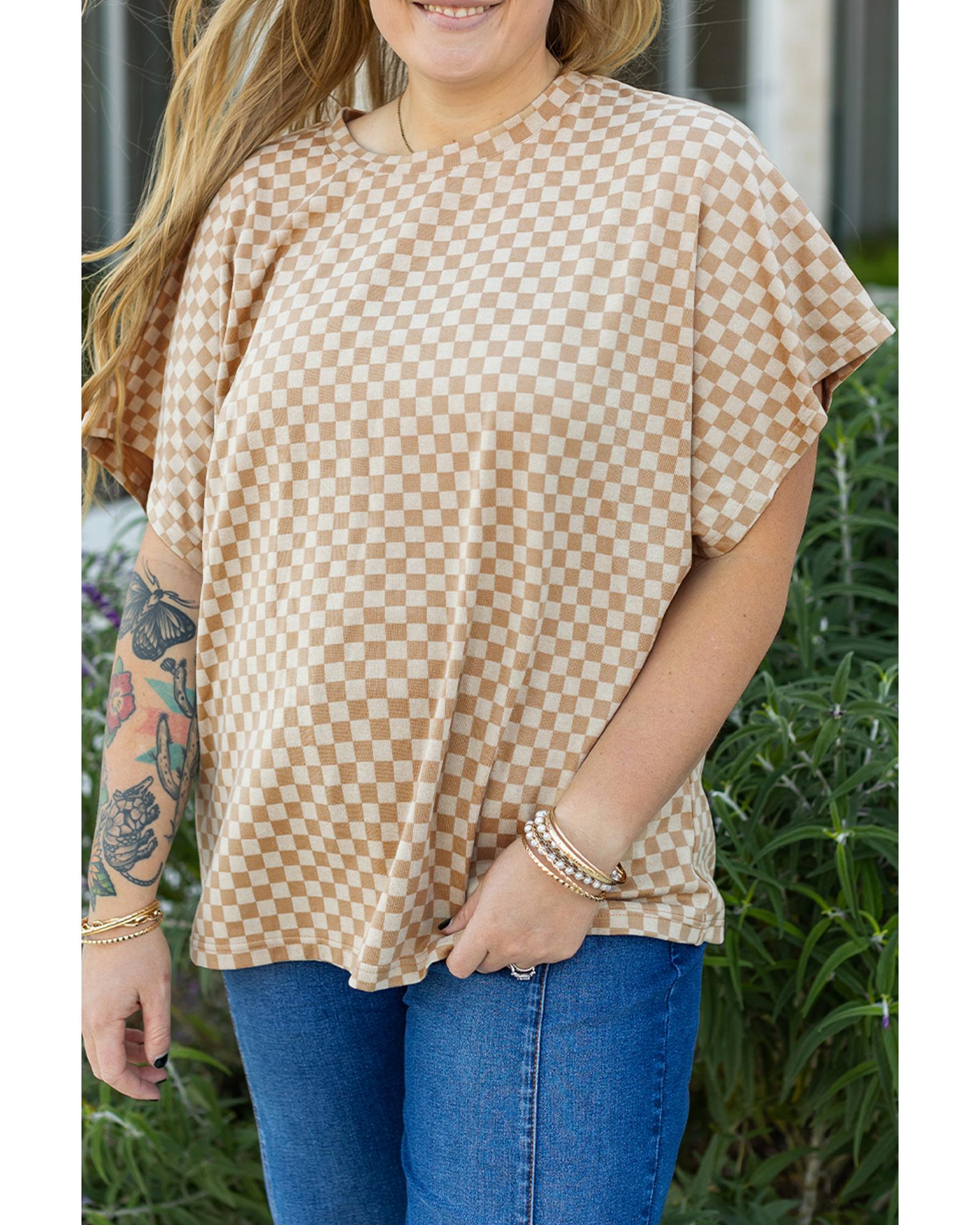 Khaki Checkerboard Short Batwing Sleeve Round Neck Plus Size T Shirt – 3X