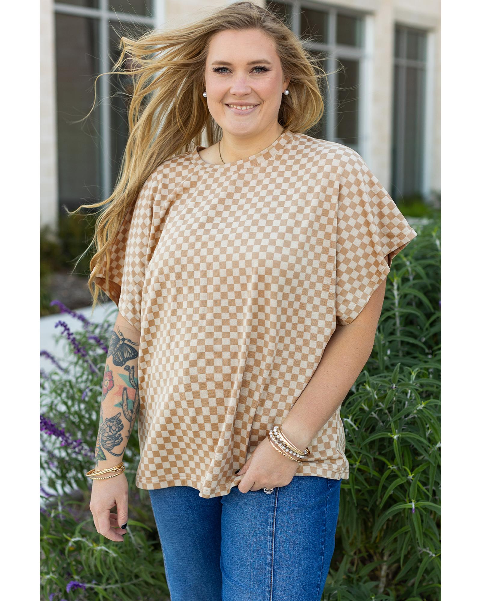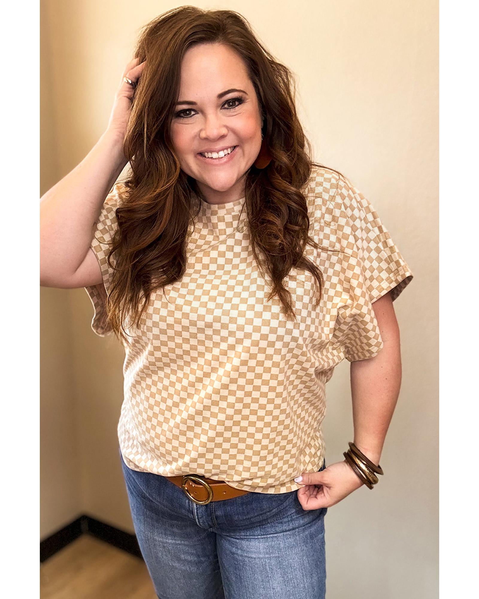 Package Content: 1 x Khaki Checkerboard Short Batwing Sleeve Round Neck Plus Size T Shirt