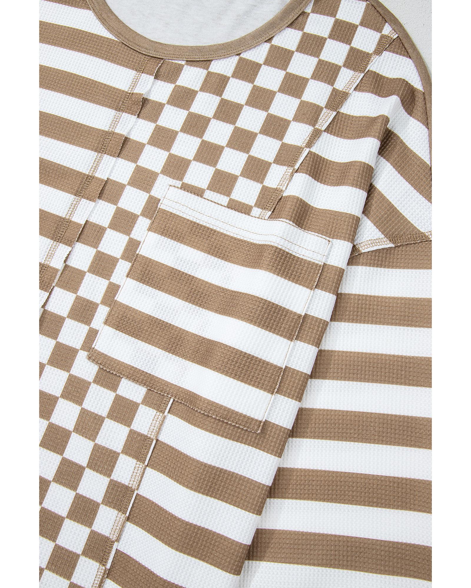 Khaki Checkerboard Striped Patchwork Lantern Sleeve Pocketed Blouse – M