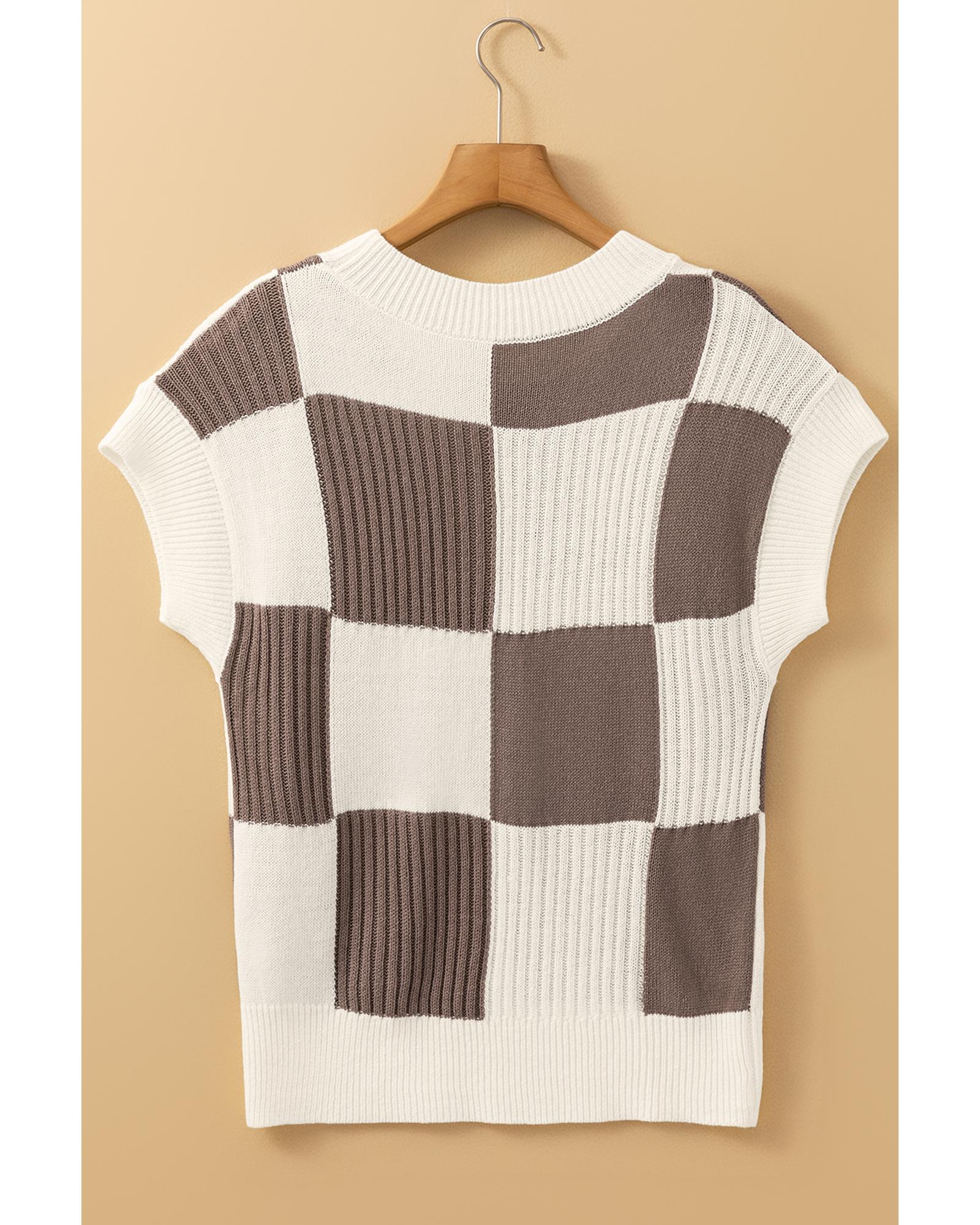 This short sleeve sweater features a stylish khaki checkered color block pattern with a classic crew neck design. It offers a casual fit suitable for various seasons, combining trendy style with comfort. Made from high-elasticity acrylic material, it provides a comfortable wearing experience.