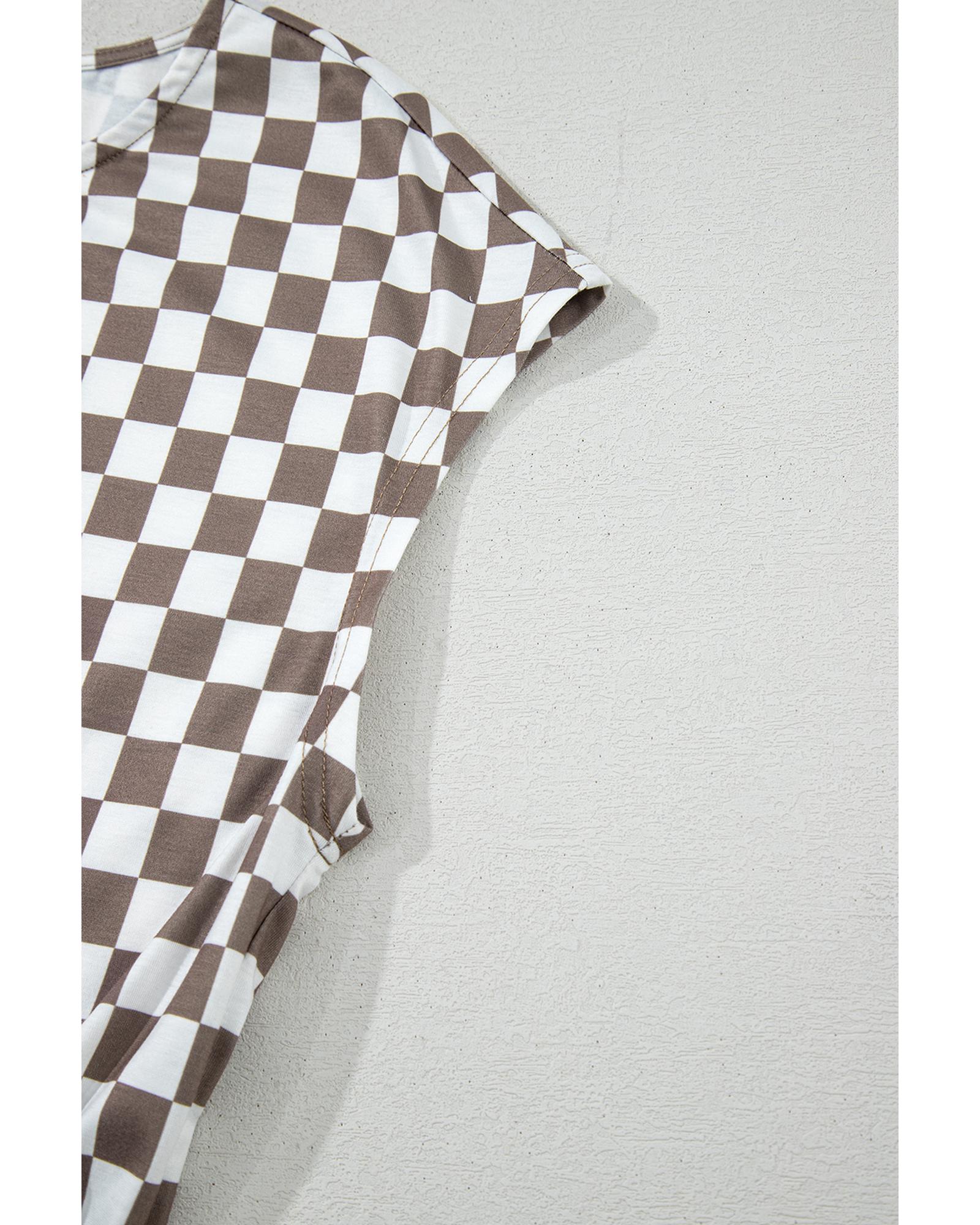 This stylish jumpsuit features a khaki checkered print with a buttoned crew neck design. It offers a wide leg silhouette for a comfortable and trendy fit, complemented by convenient side pockets and cap sleeves. The fabric provides medium elasticity, ensuring ease of movement and a flattering fit.