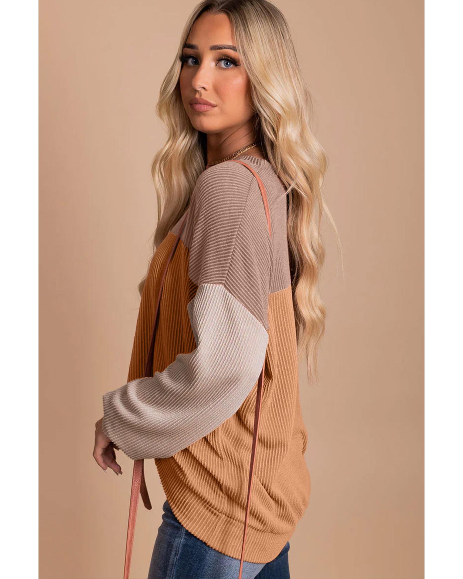 This khaki color block long sleeve ribbed loose top offers a trendy and comfortable style suitable for various casual occasions. Its eye-catching color block design and ribbed texture provide a flattering fit and a chic appearance. The long sleeves add extra coverage, making it a versatile addition to your wardrobe.