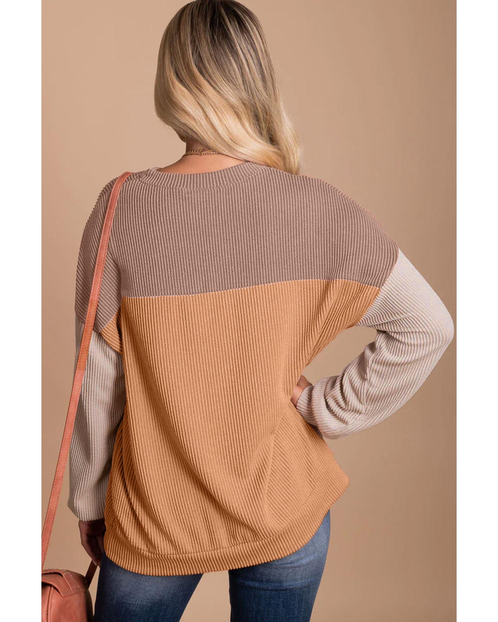 - 1 x Khaki Color Block Long Sleeve Ribbed Loose Top