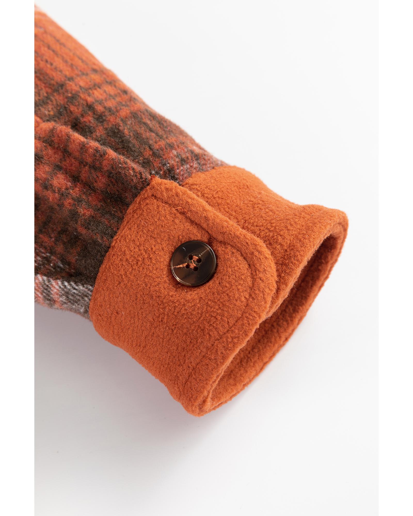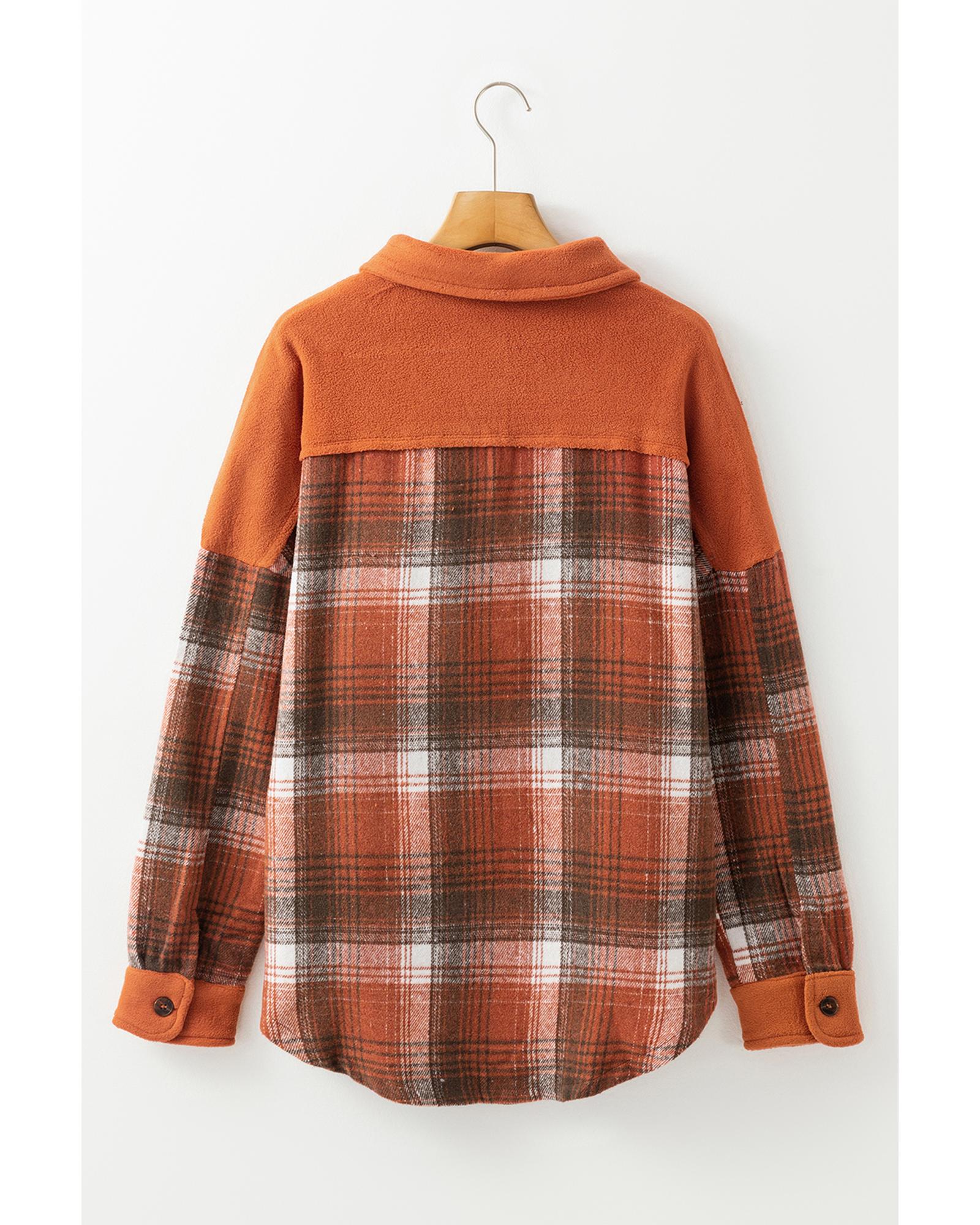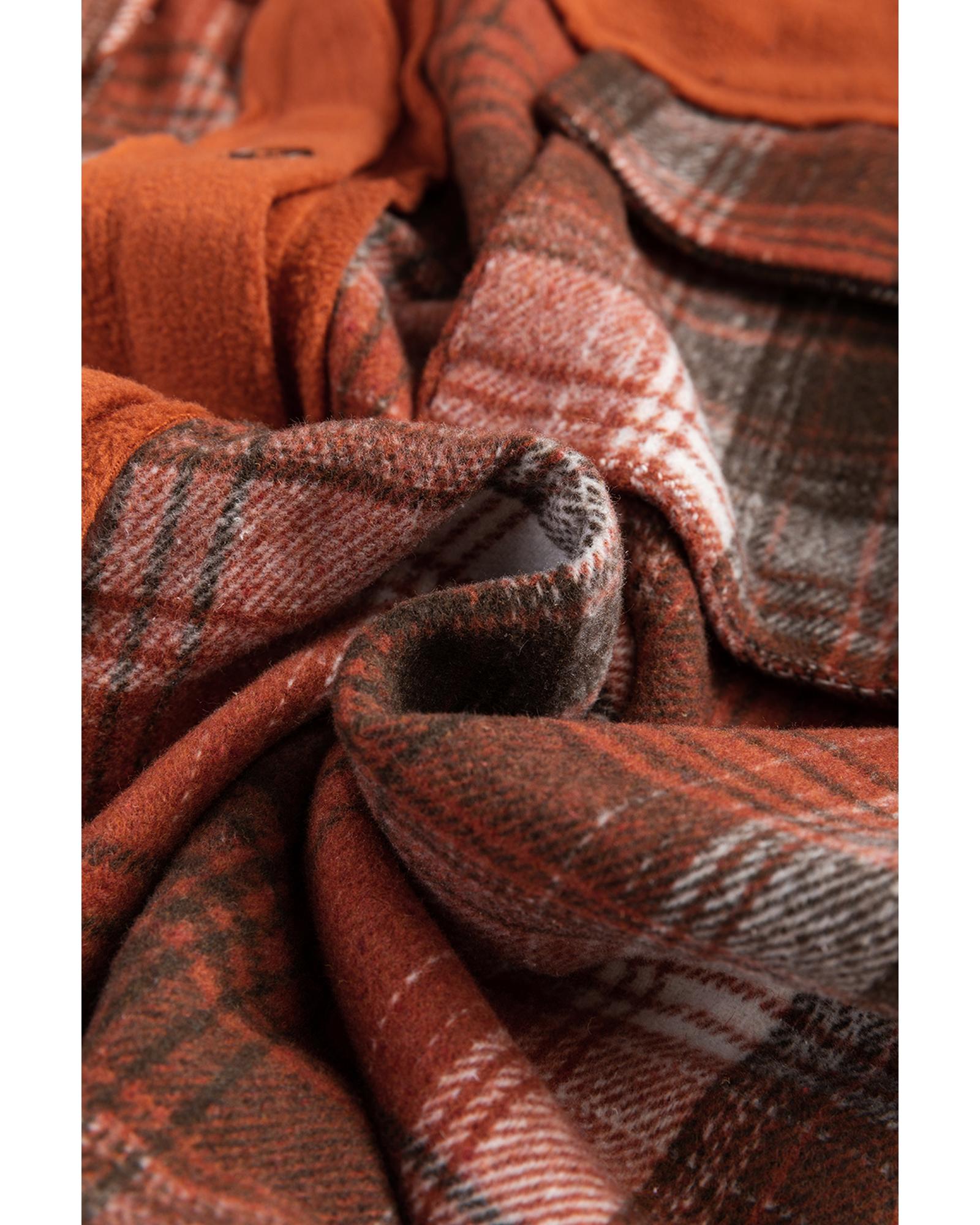 This stylish shacket features a khaki colorblock plaid pattern with a trendy fitted silhouette. Designed with a shirt collar and buttoned closure, it offers a polished and versatile look suitable for various occasions. The piece includes functional chest pockets with flap closures, combining fashion with practicality.