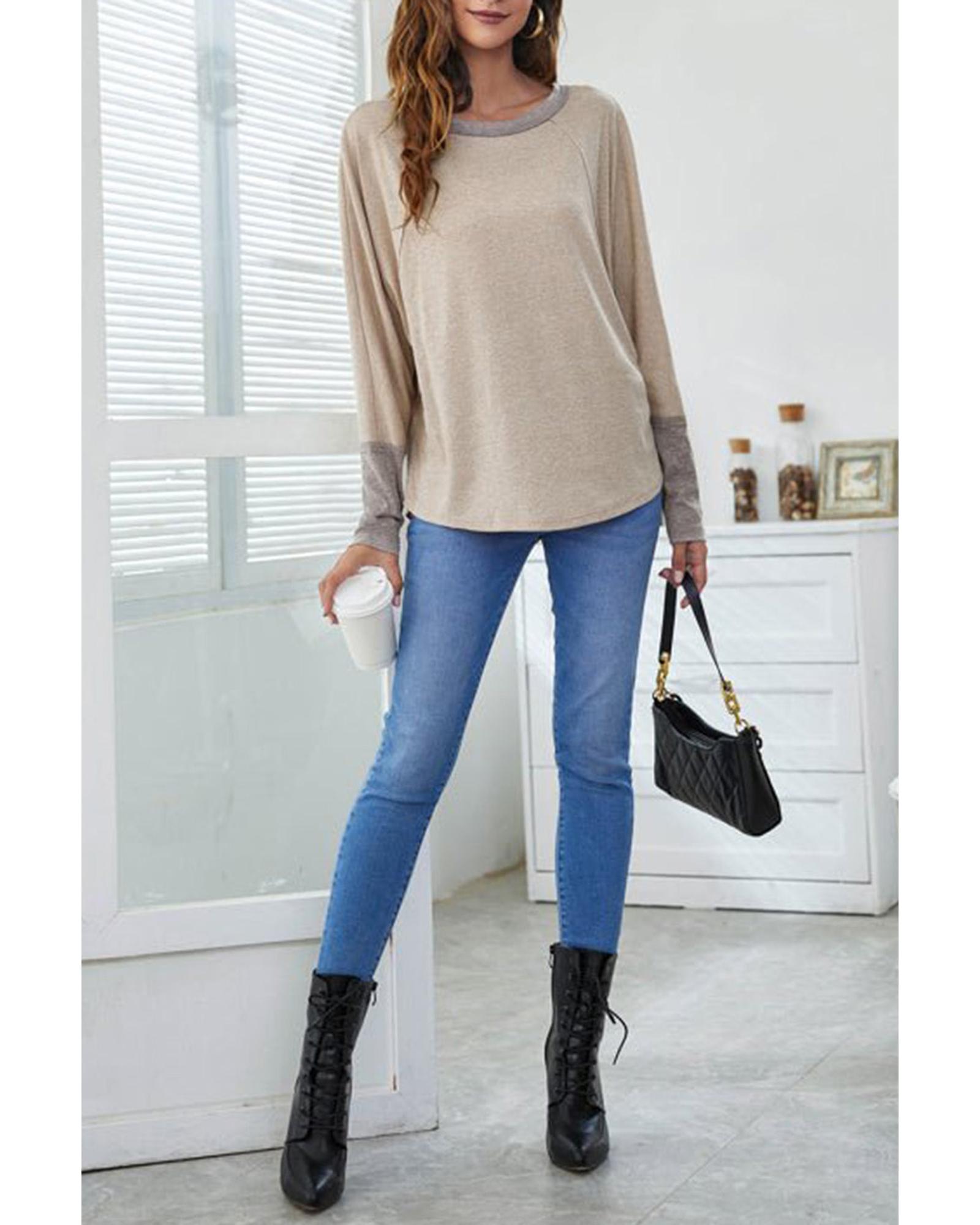 This khaki top features a relaxed fit with contrasting cuffs and neckline, offering a simple yet stylish look. The batwing sleeves add to the comfort and versatility of the design, making it suitable for various casual occasions. It pairs well with jeans, shorts, or pants, making it a versatile addition to any wardrobe.