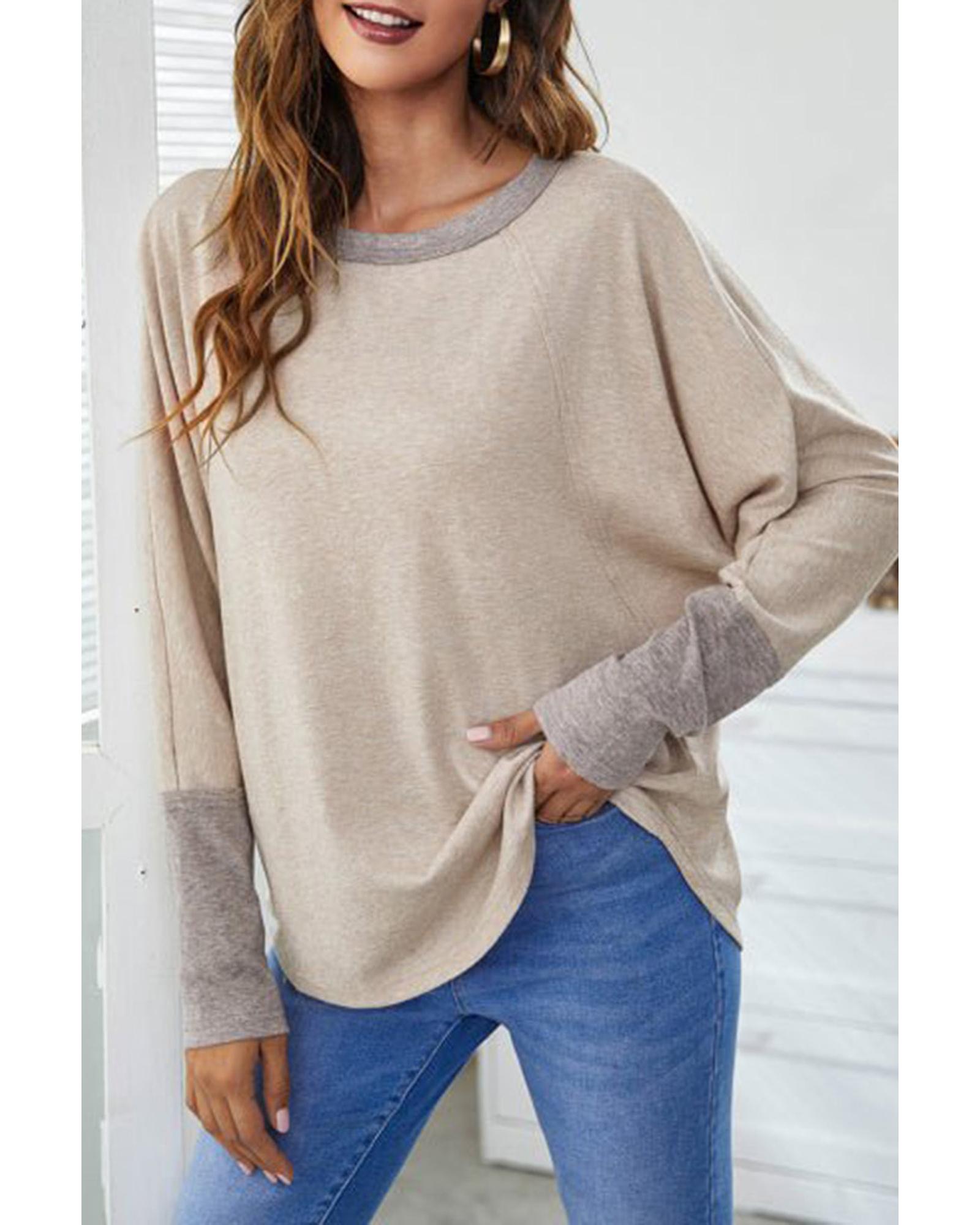 This khaki-colored loose top features contrasting cuffs and neckline, combined with a stylish batwing sleeve design. Its versatile and relaxed fit makes it suitable for various casual occasions, easily pairing with jeans, shorts, or pants.
