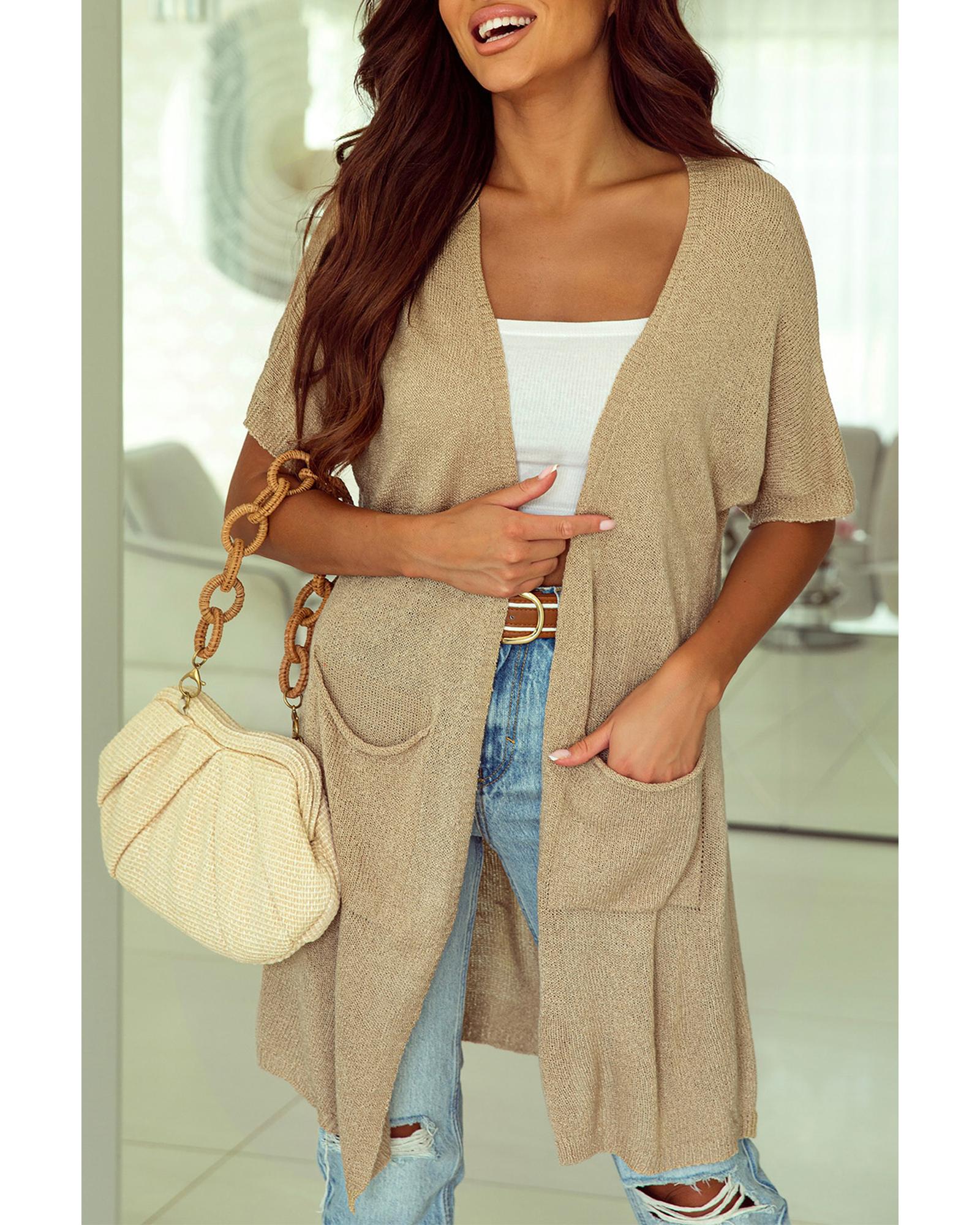 This khaki long cardigan features a stylish and versatile design with half dolman sleeves and convenient pockets. Its open front makes it easy to wear and suitable for various looks, providing both comfort and functionality.
