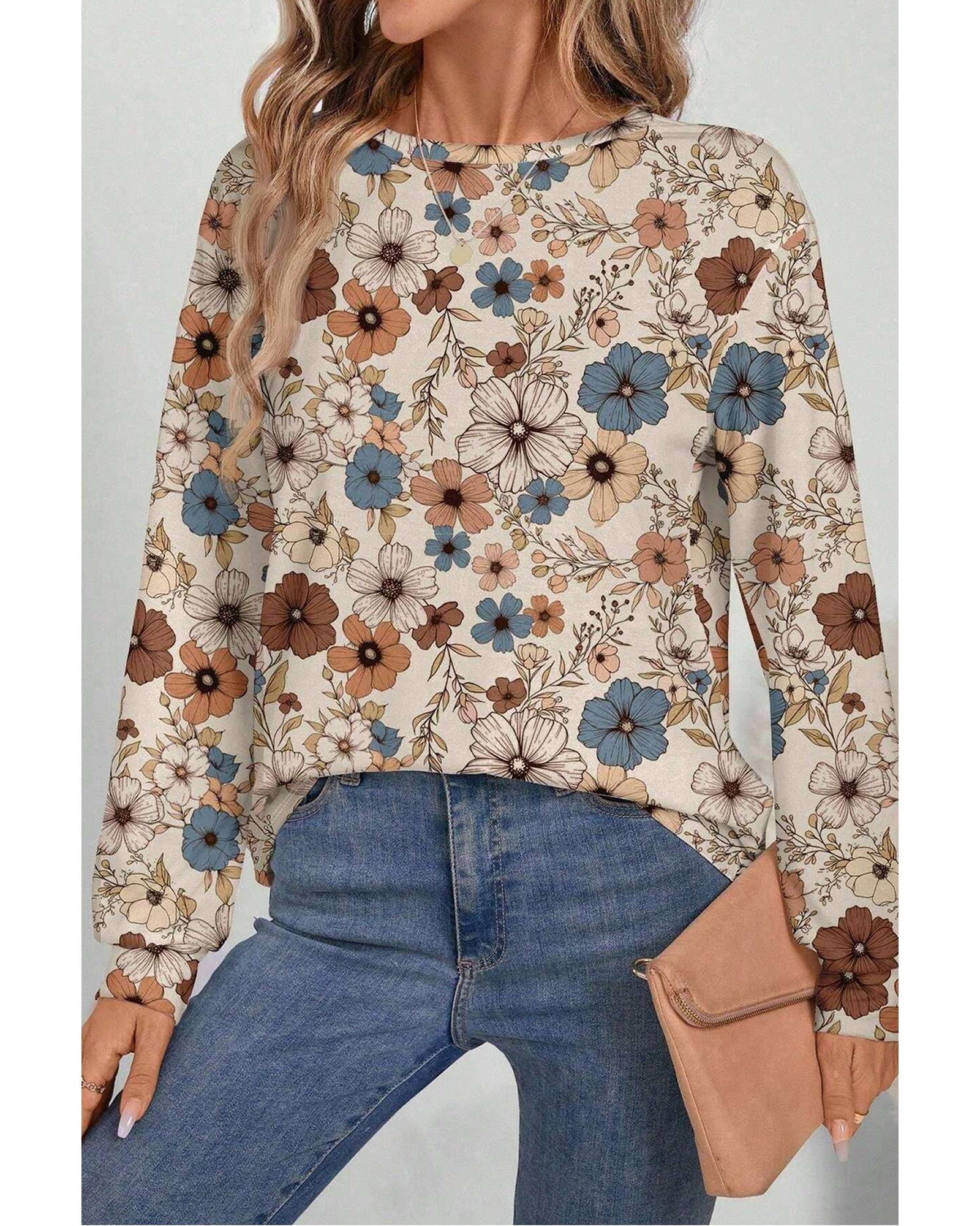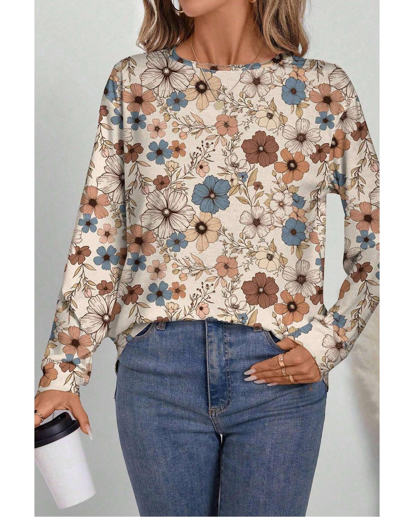 Khaki Floral Print Loose Crew Neck Long Sleeve T Shirt – L