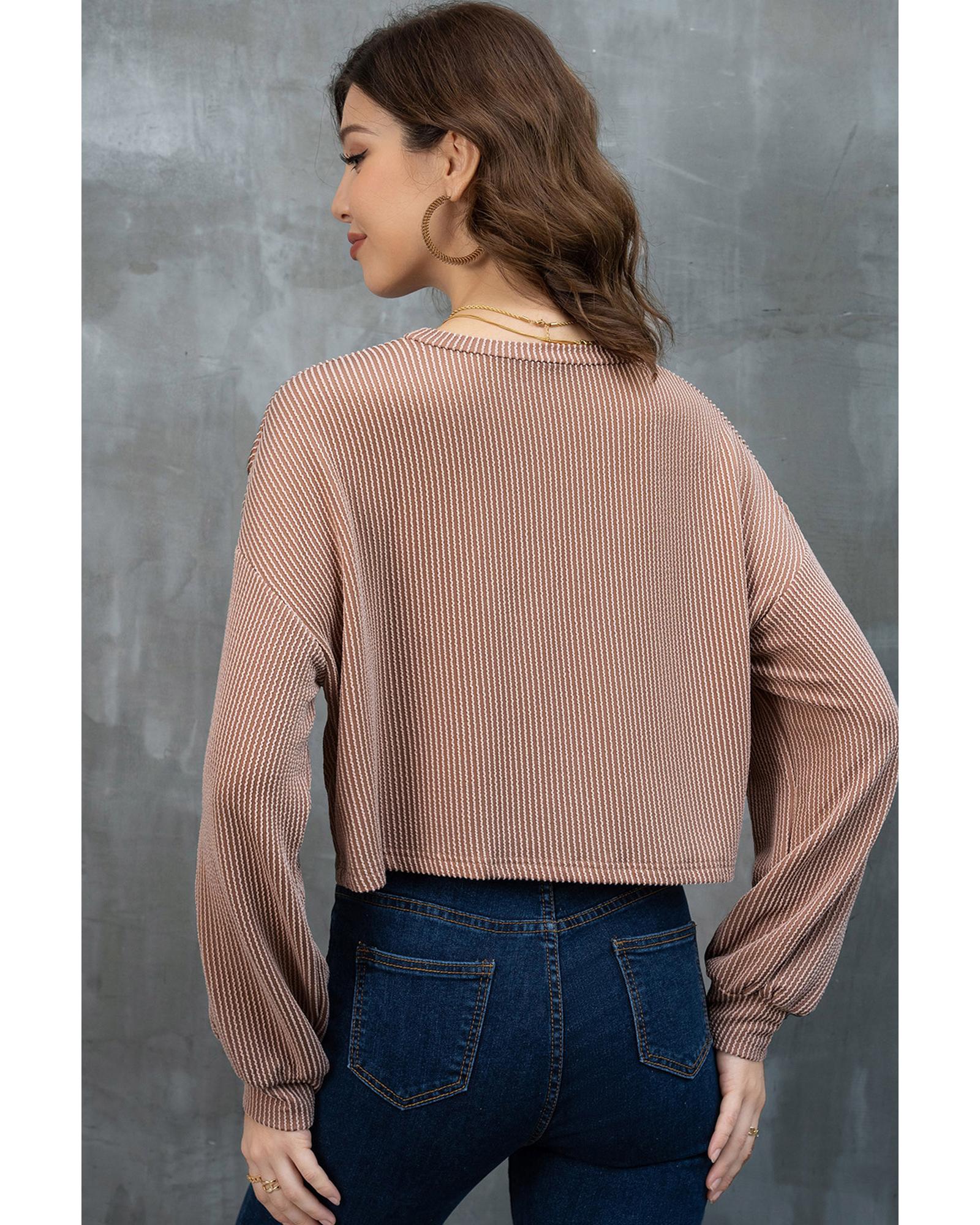 Apricot Leopard Splicing Exposed Seam Waffle Knit Top - M