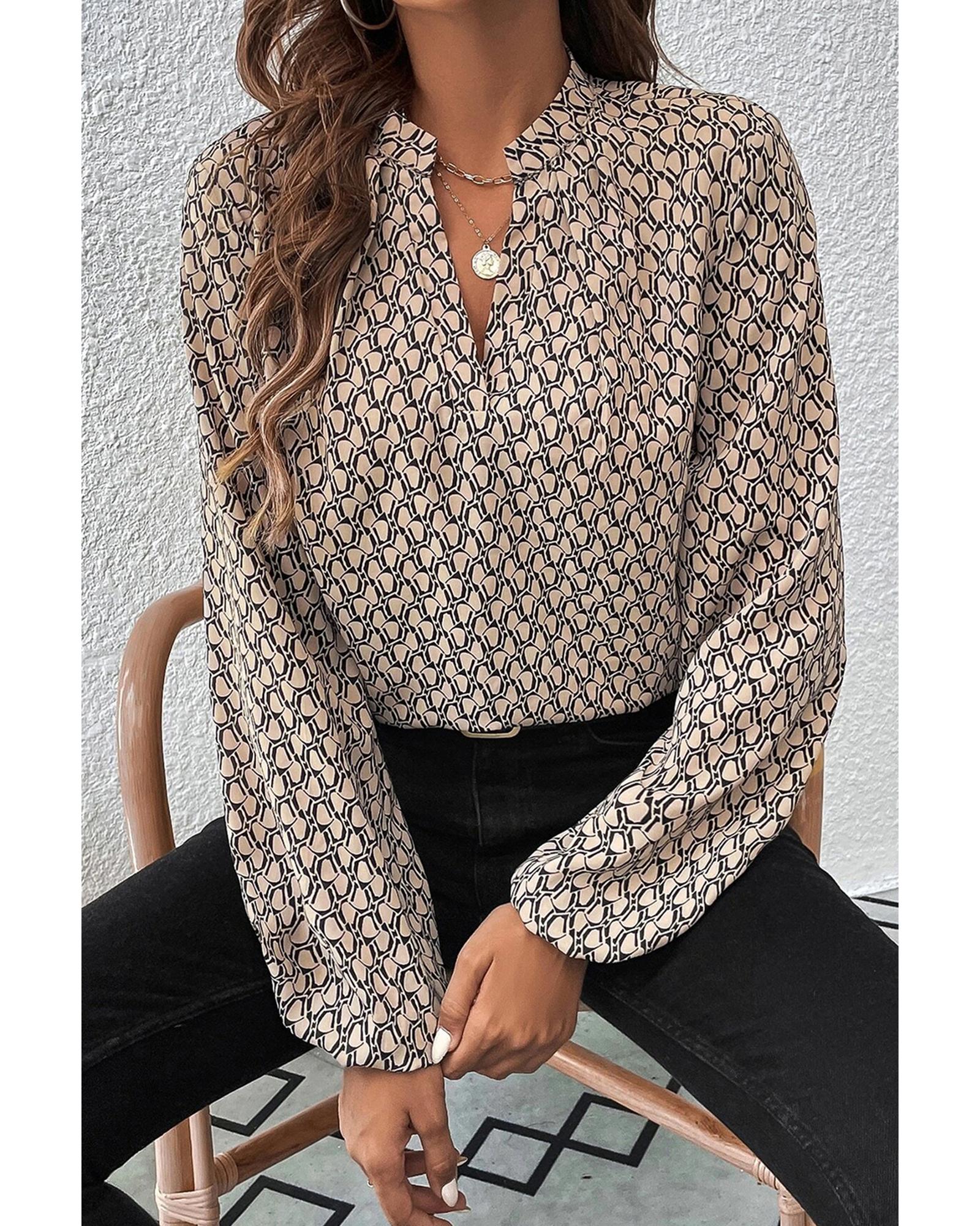 Khaki Geometric Print Notched Neck Puff Sleeve Blouse – S