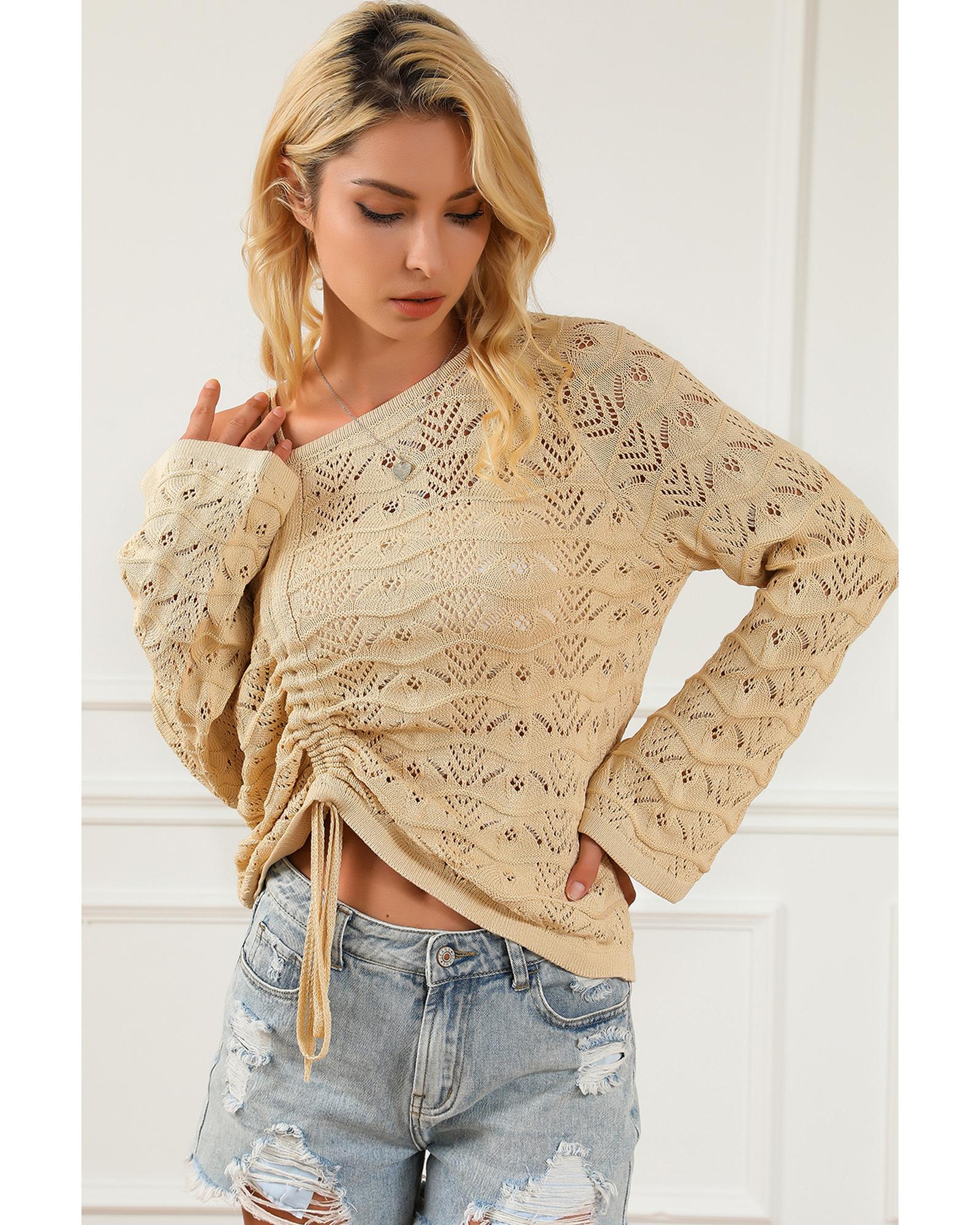 This sweater features a trendy hollowed knit design with an asymmetric neckline, offering a modern and fashionable look. The drawstring ruched accents enhance the silhouette, making it suitable for layering or wearing alone for a chic style. Available in multiple sizes, it is designed to provide a fitted and stylish appearance.