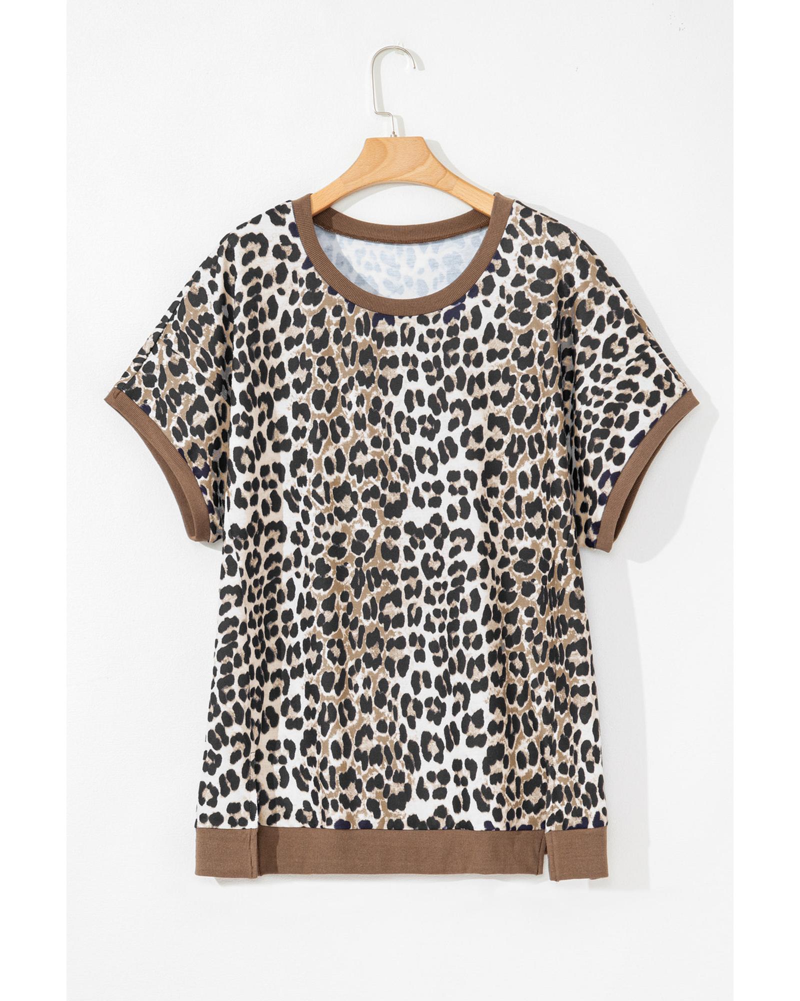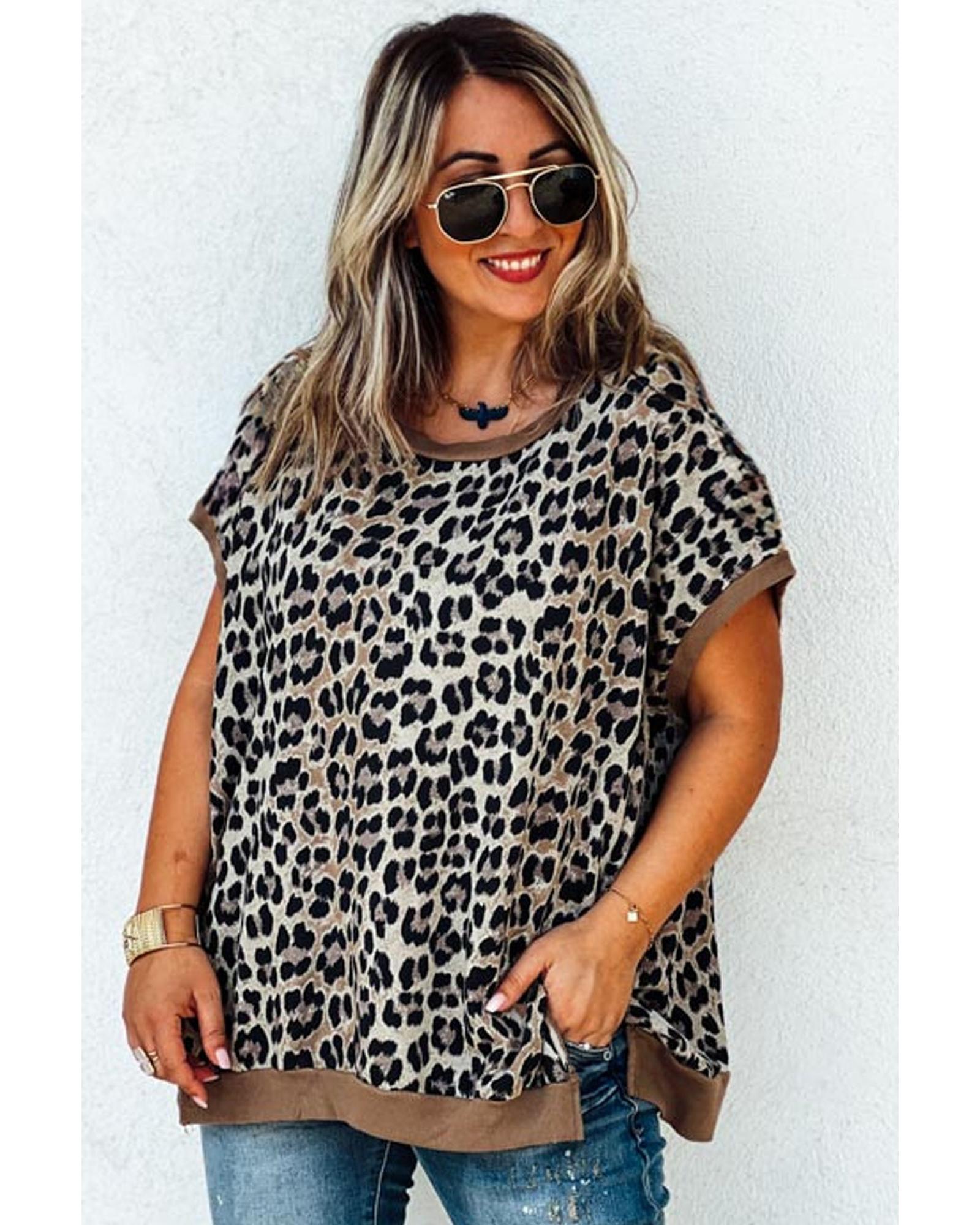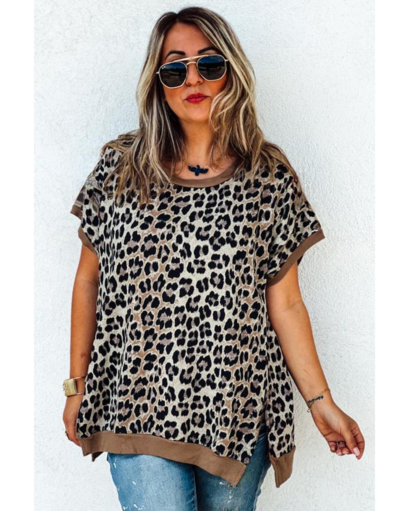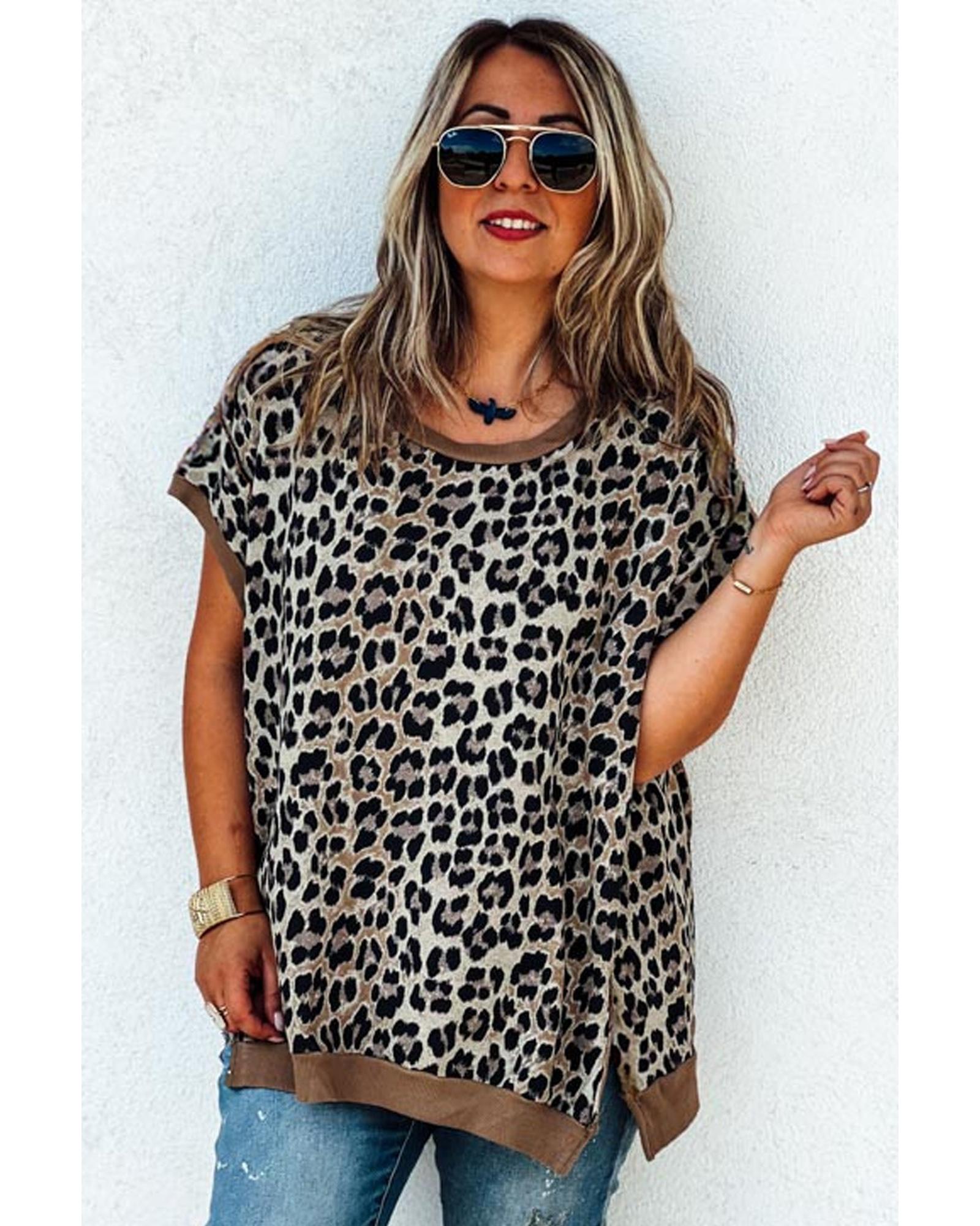 This stylish short sleeve top features a trendy leopard print with contrasting trim, creating a modern and structured look. Designed with a loose fit, it offers a flattering silhouette for plus size figures and can be paired easily with various fashion bottoms for a complete outfit.