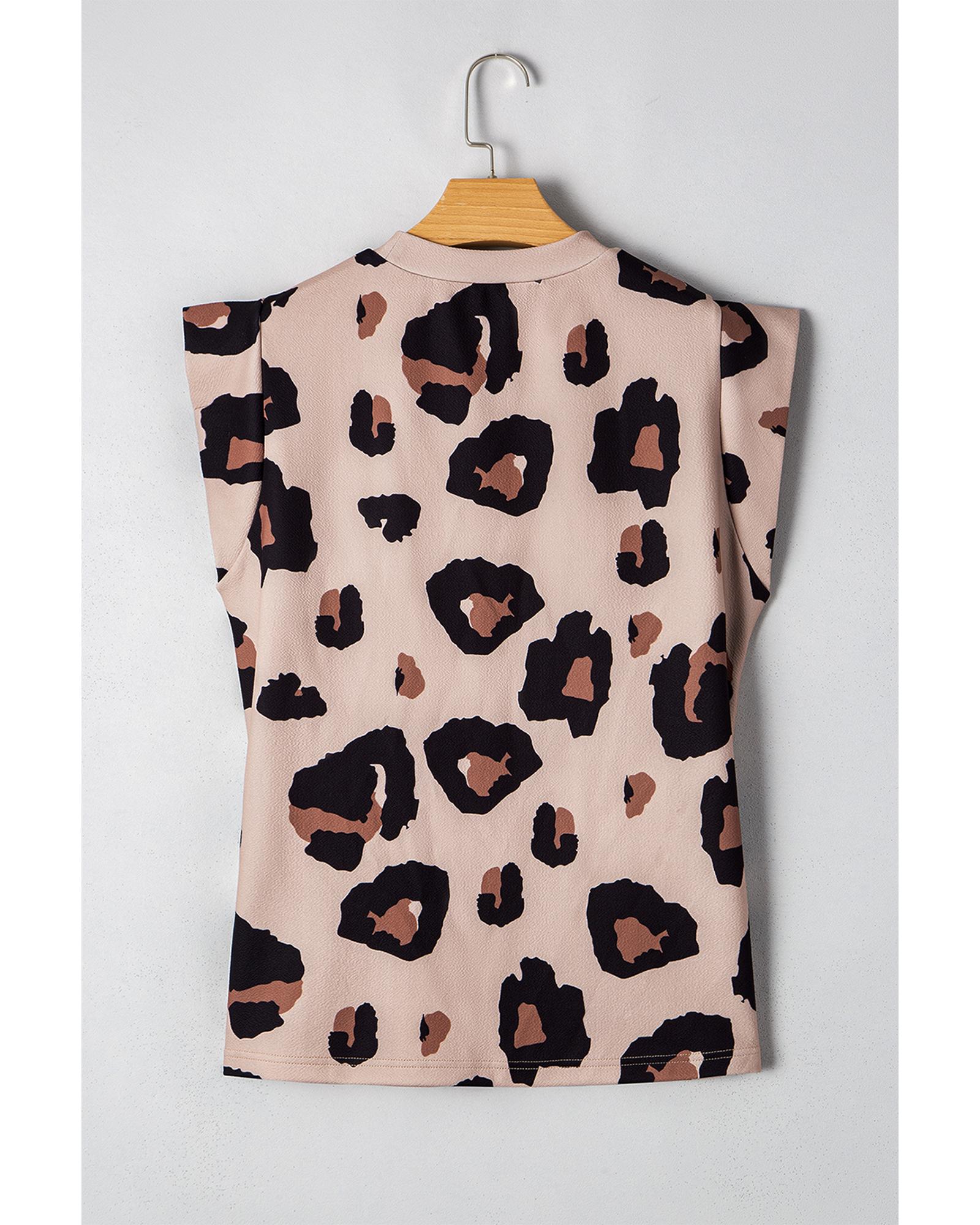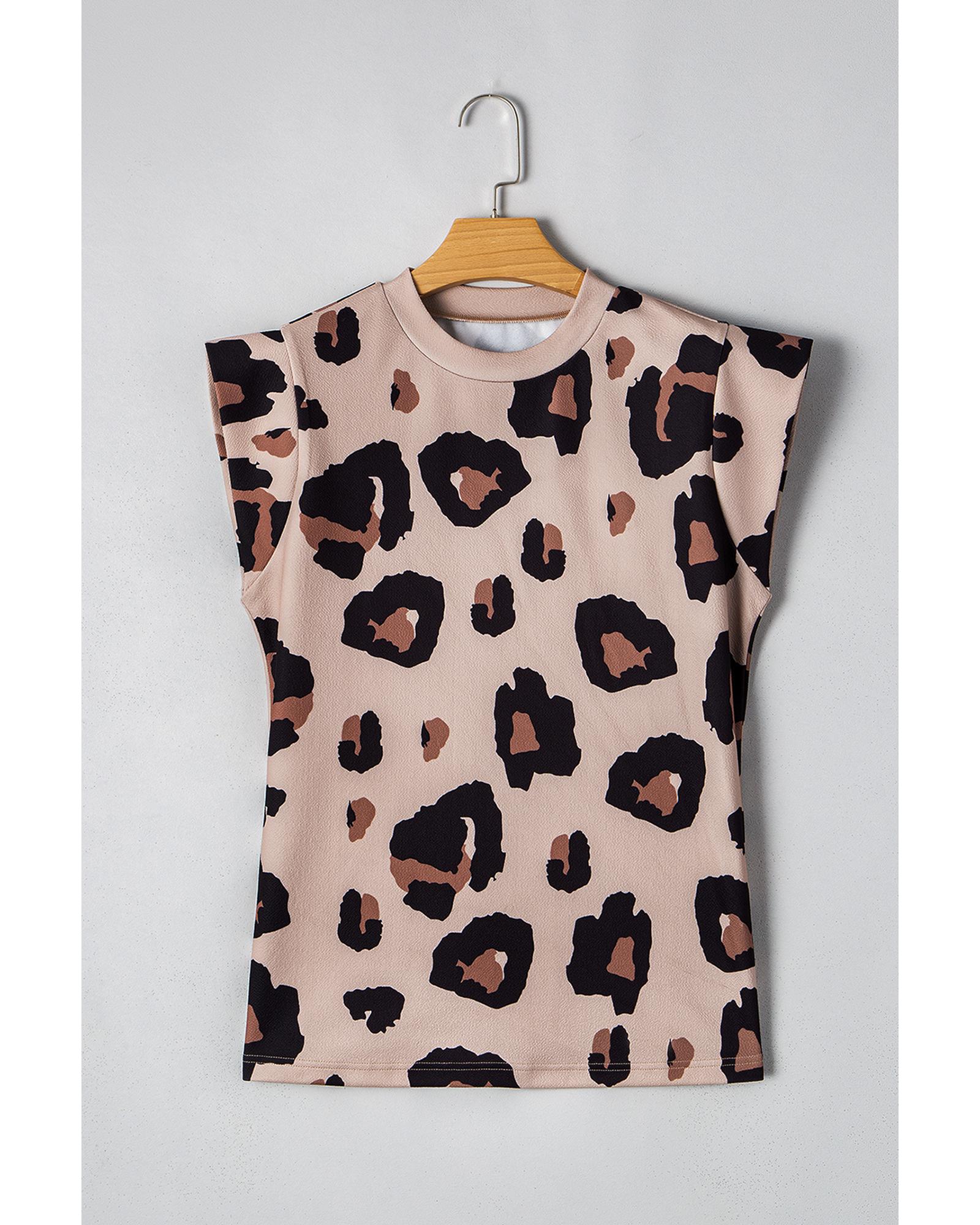 Khaki Leopard Crew Neck Cap Sleeve Casual Tee – XL