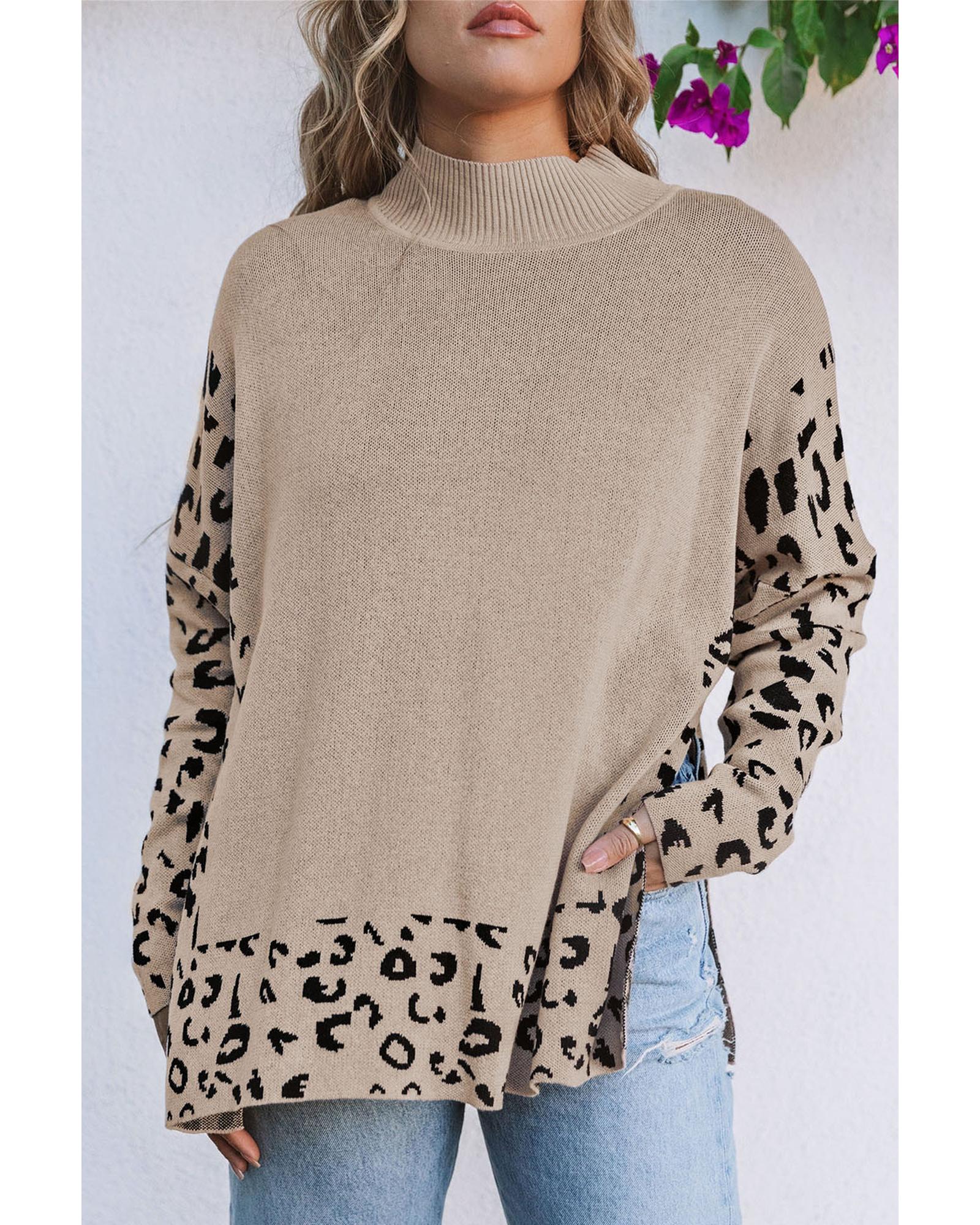 This oversized sweater features a high neck and side slit design, offering a relaxed and trendy look. Its khaki leopard print adds a stylish touch, making it suitable for casual fall and winter outfits. Crafted from soft, breathable, and lightweight knit material, it provides comfort and warmth for everyday wear.