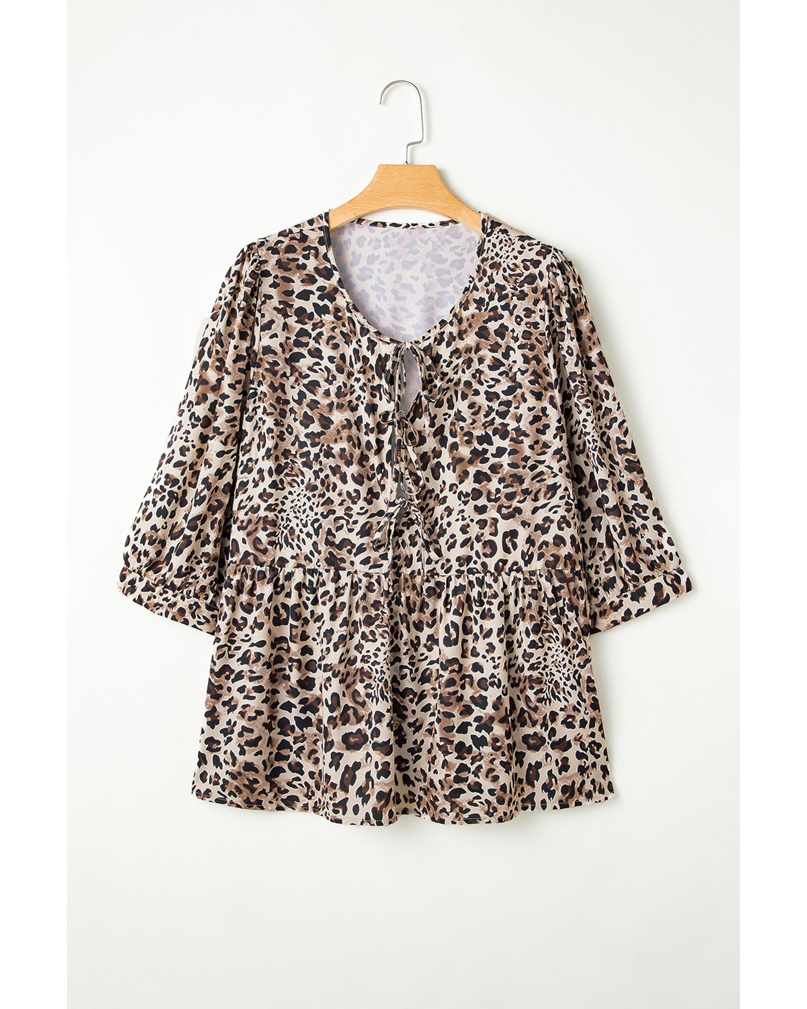 This stylish blouse features a trendy leopard print design with elegant lace-up details and ruffled accents. The feminine peplum cut and 3/4 sleeves add a sophisticated touch, making it suitable for various occasions. Designed with a fitted silhouette, it offers a fashionable look in plus sizes.