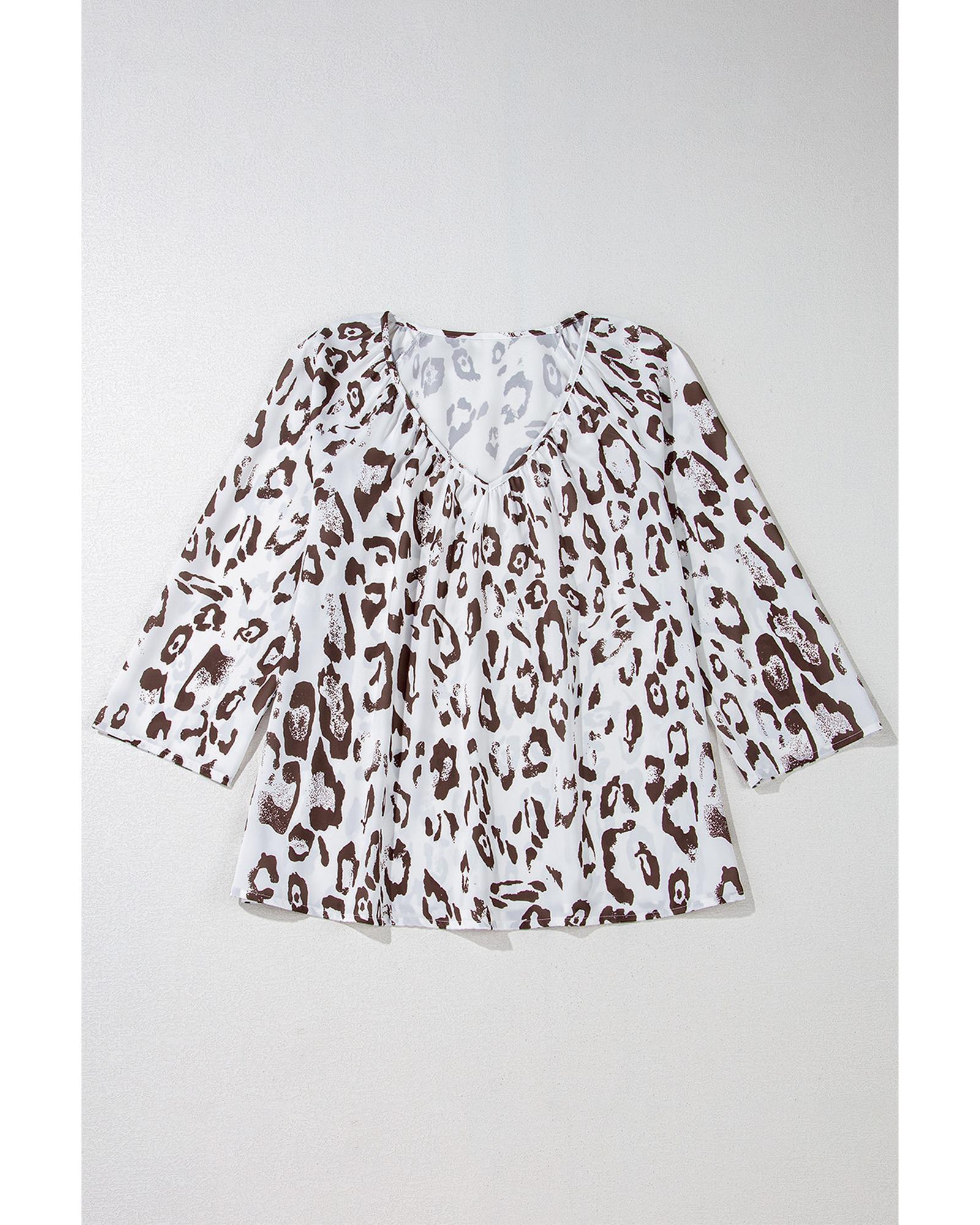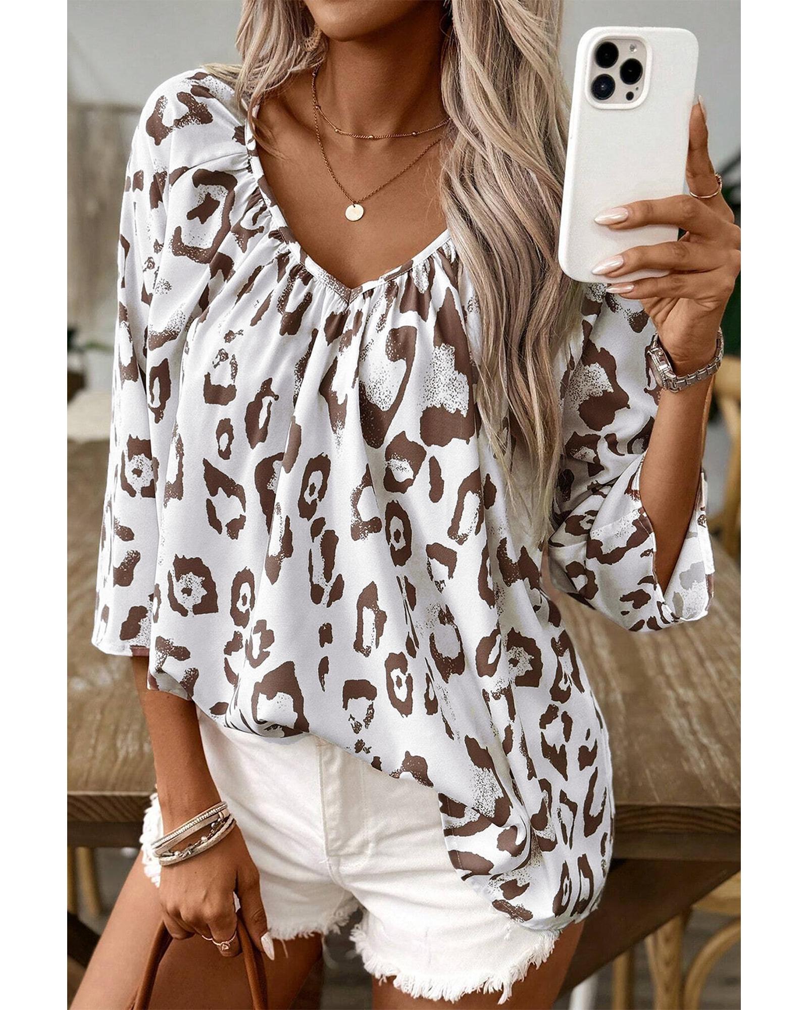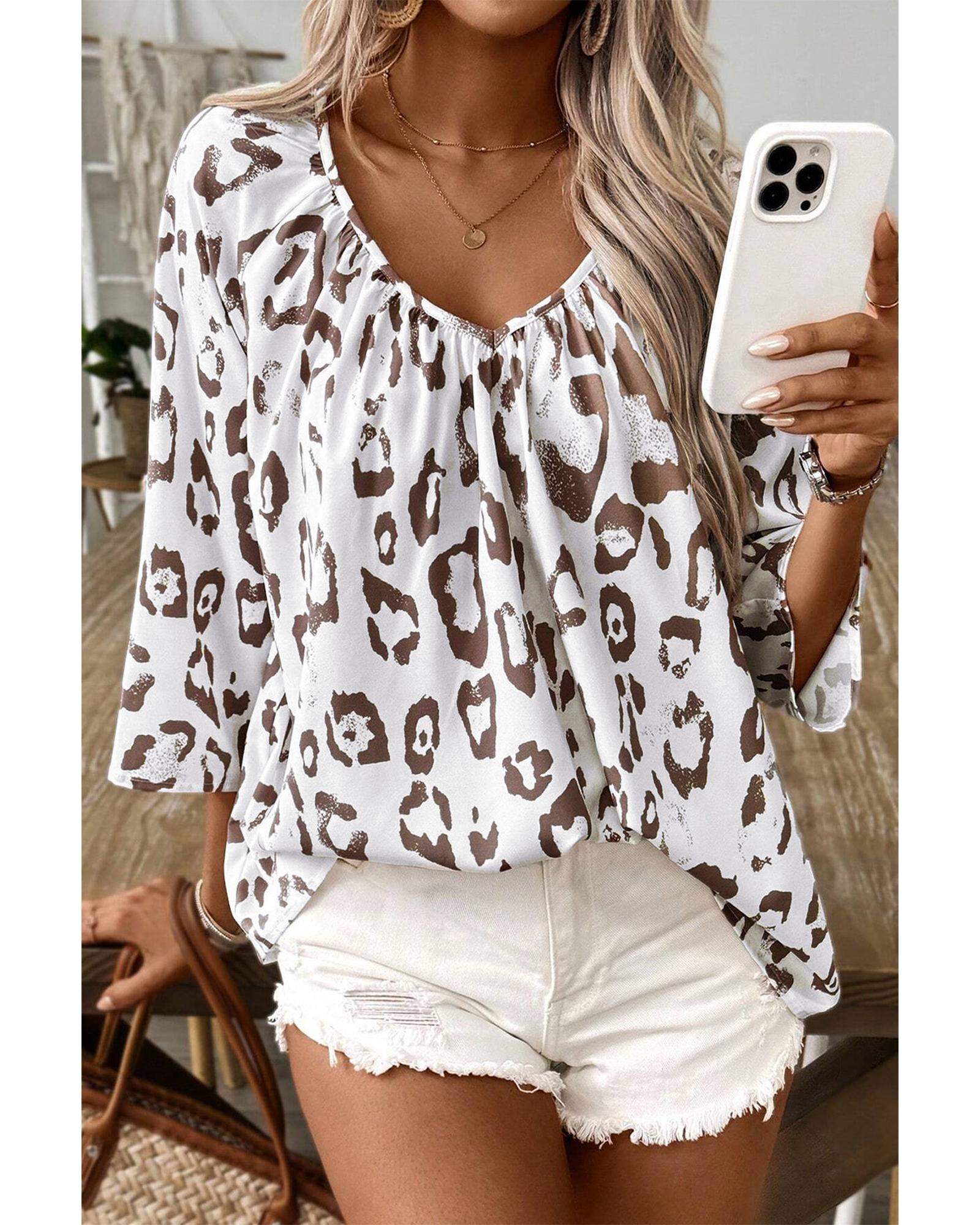 This stylish blouse features a bold leopard print and a flattering V neckline, combining trendy design with versatile 3/4 sleeves. The ruched detailing adds a textured finish, making it suitable for various occasions and styles.