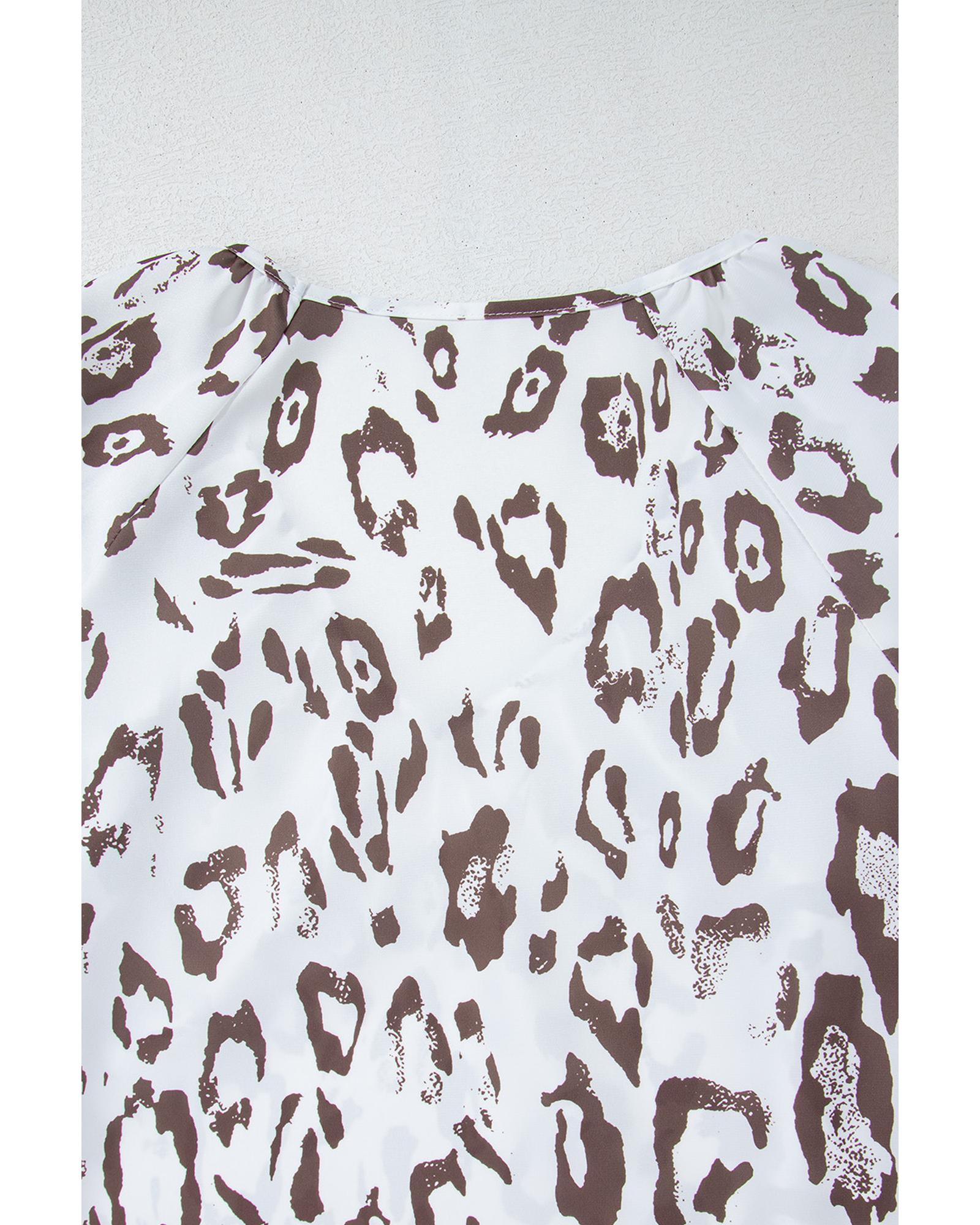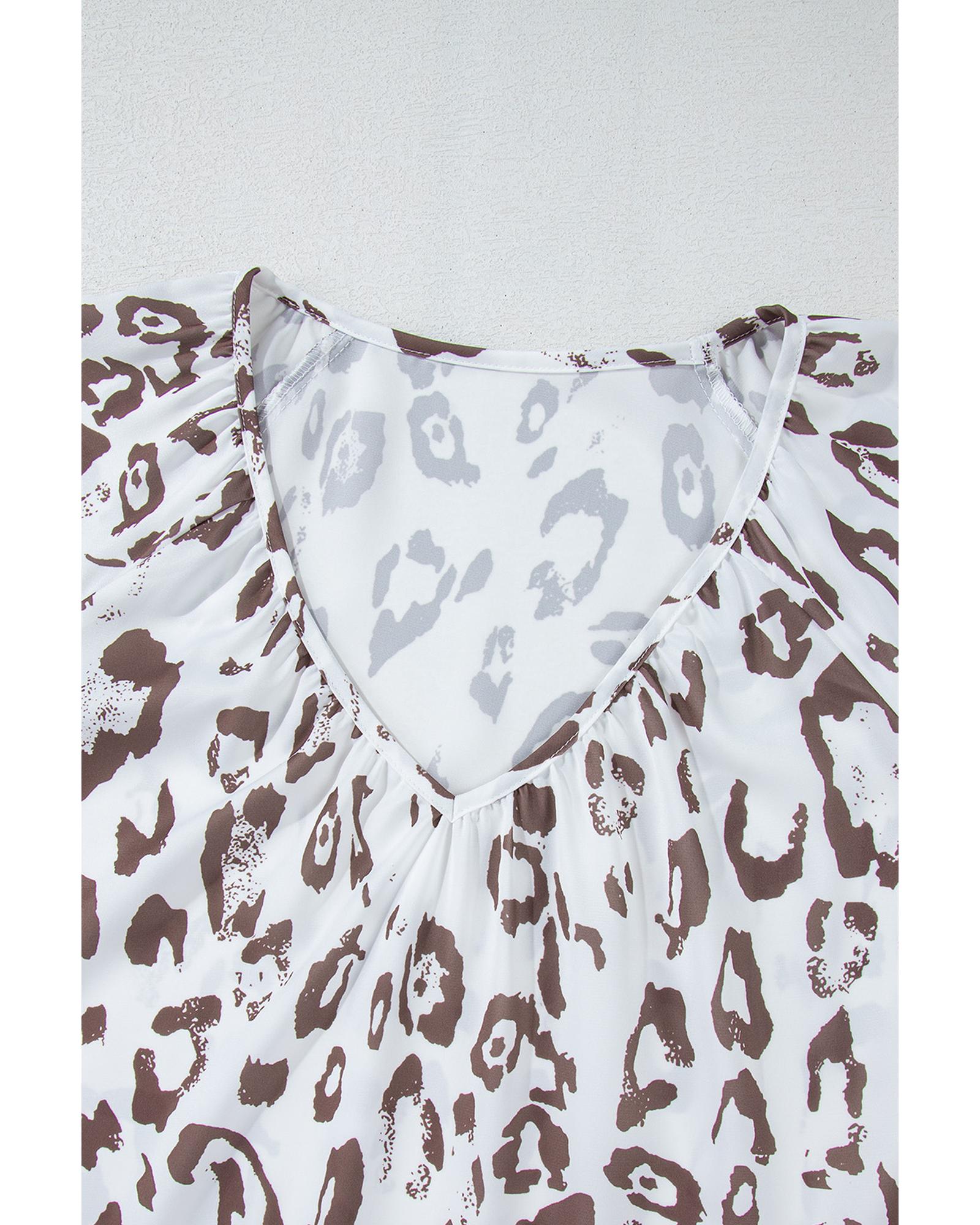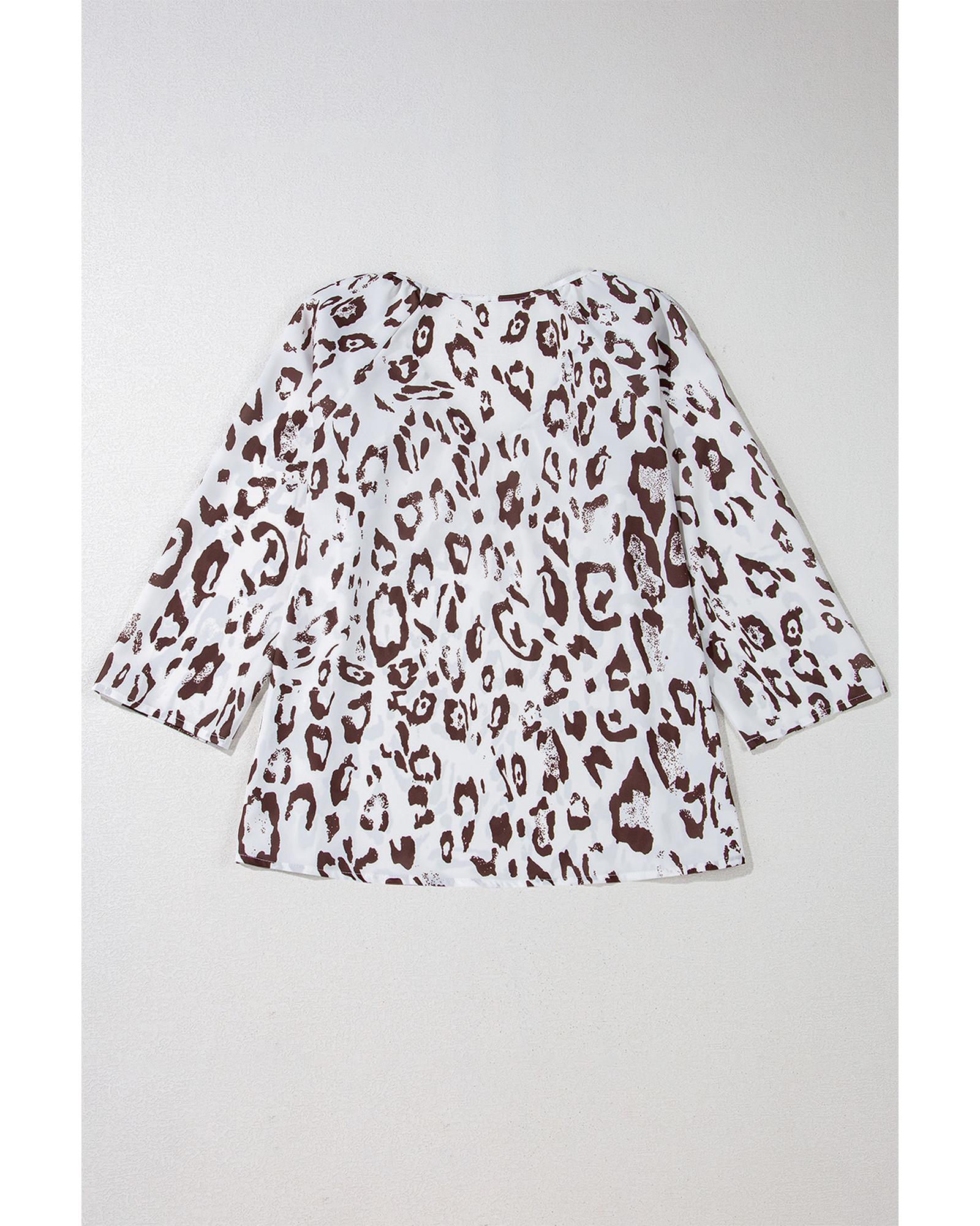 This stylish blouse features a bold leopard print and a flattering V neckline, combining trendy design with versatile 3/4 sleeves. The ruched detailing adds a textured finish, making it suitable for various occasions and styles.