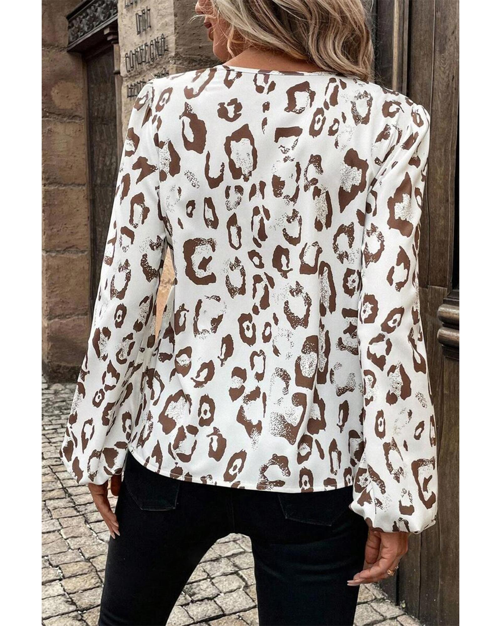 This stylish khaki leopard print blouse features a split neck design and dramatic balloon sleeves, making it a perfect addition to your fall wardrobe. Its trendy fitted look is designed to flatter, and it pairs beautifully with tailored pants or skirts.