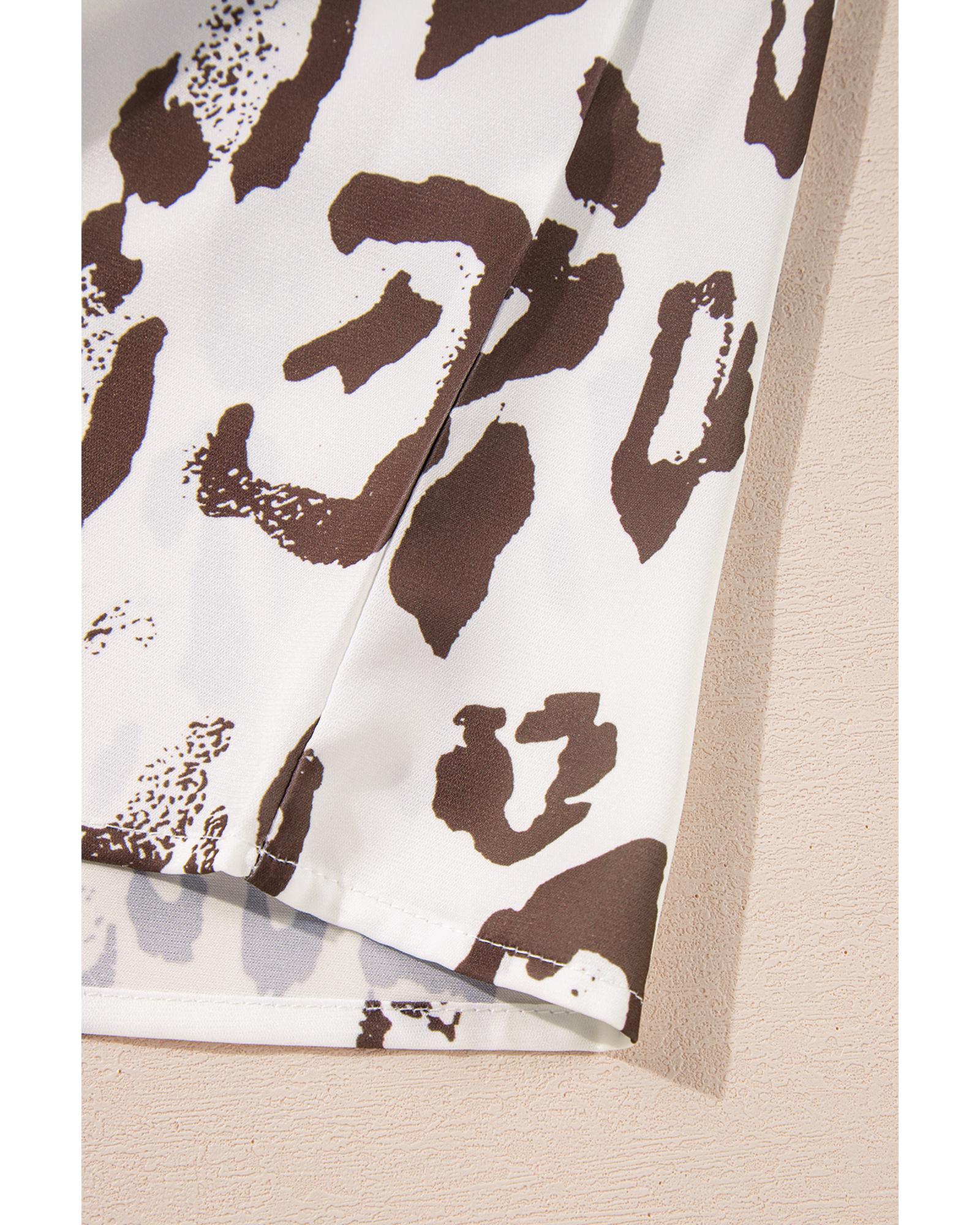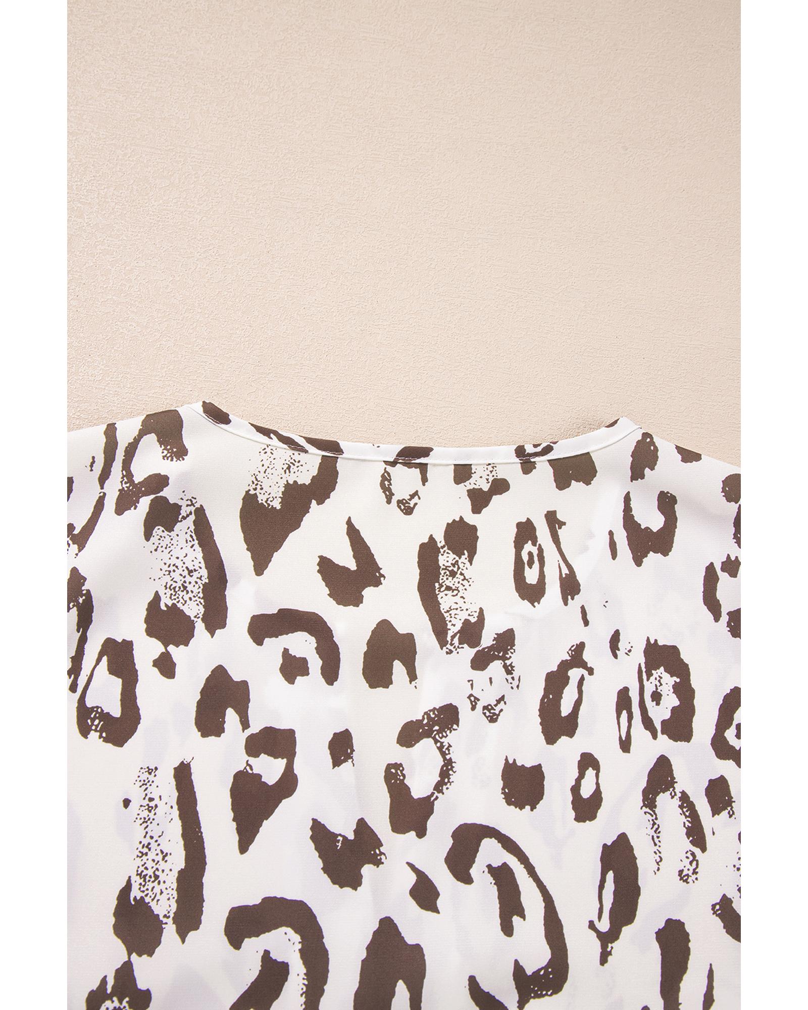 This stylish blouse features a trendy khaki leopard print and is designed to enhance your fall wardrobe. With its flattering split neck and dramatic balloon sleeves, it offers both comfort and elegance, making it a versatile choice for various occasions.