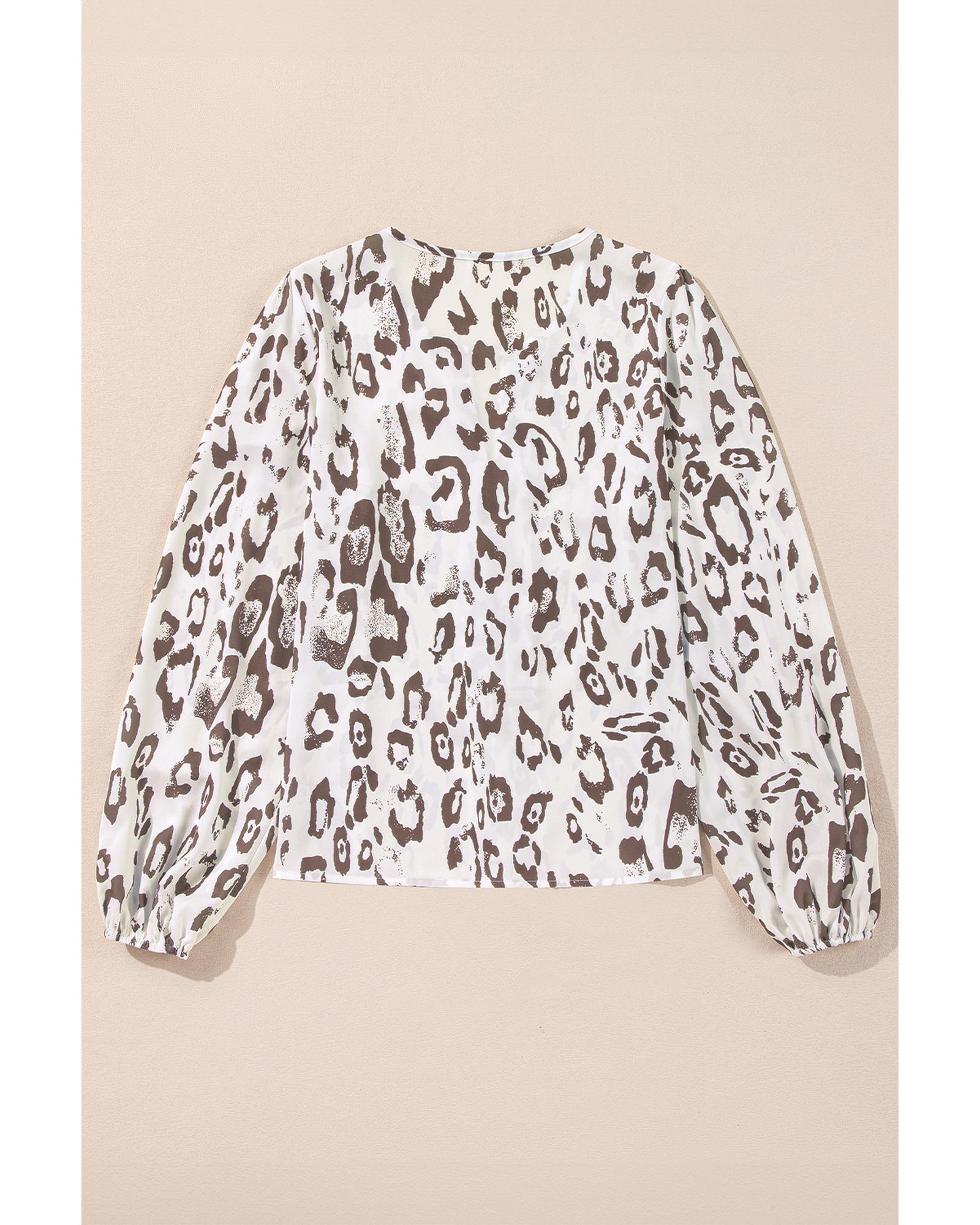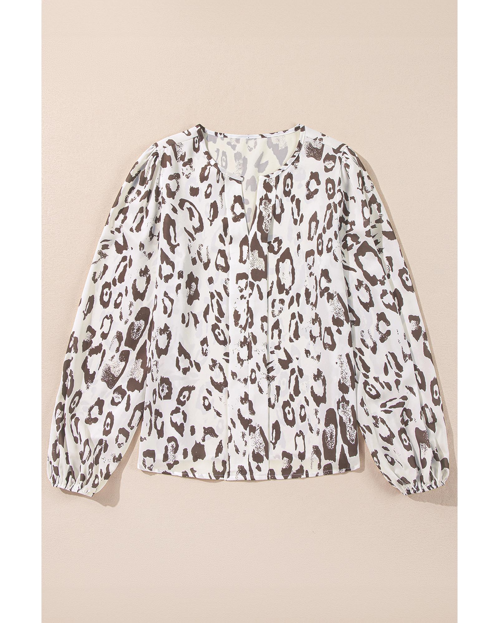 This stylish khaki leopard print blouse features a split neck design and dramatic balloon sleeves, making it a perfect addition to your fall wardrobe. Its trendy fitted look is designed to flatter and can be easily paired with tailored pants or skirts for a chic outfit.