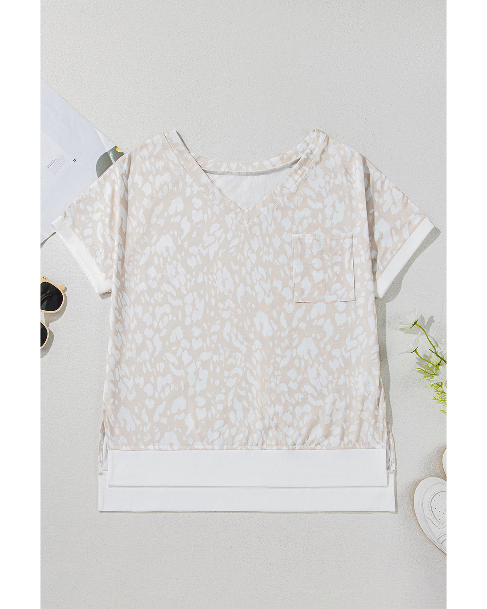 Package Content: 1 Khaki Leopard Print V Neck Side Slit Loose Fit T Shirt
