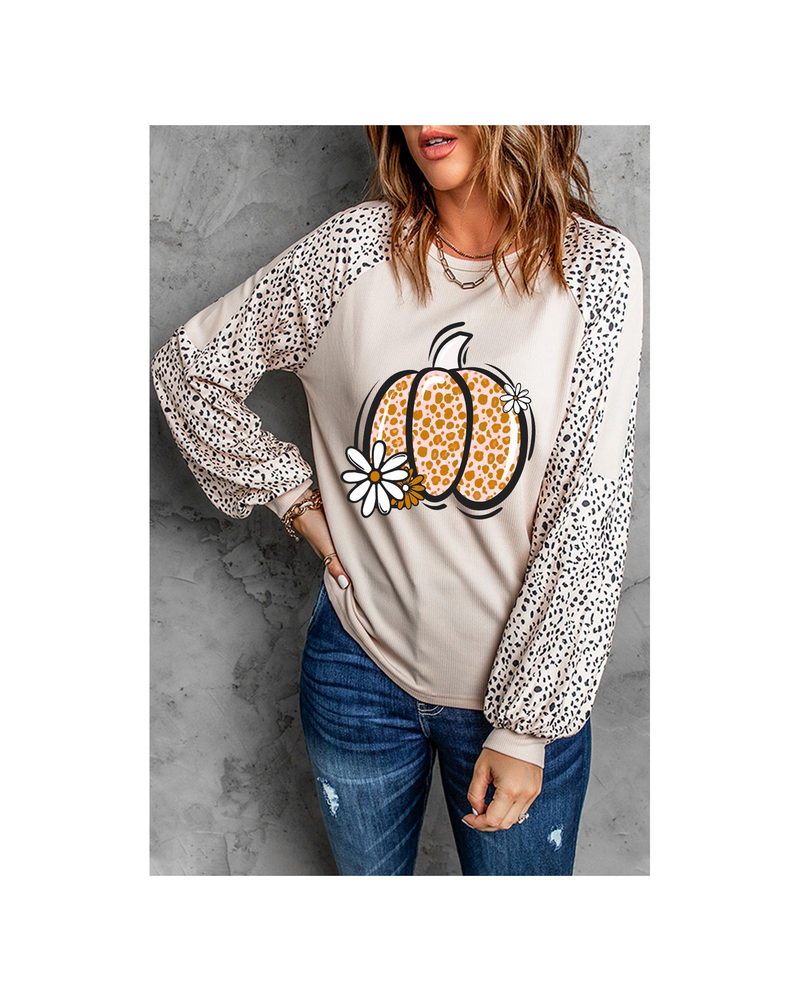 This long sleeve top features a stylish khaki leopard print combined with floral and pumpkin graphic details, offering a trendy and elegant look suitable for various occasions. Its fitted design provides a fashionable silhouette, making it a versatile addition to your wardrobe.