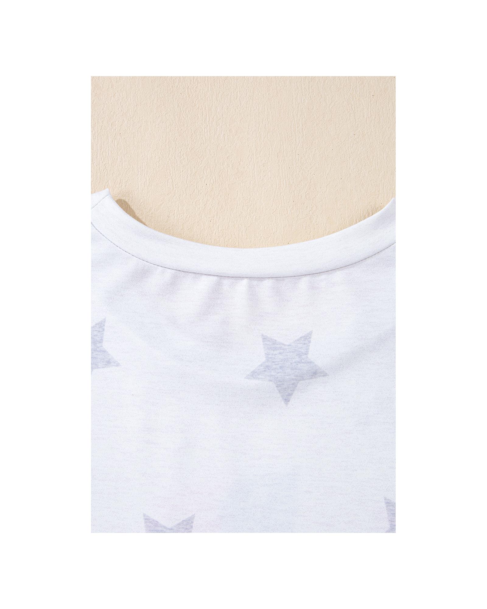 This patriotic-themed T-shirt features a starry print with a flag bow graphic on the front, making it suitable for celebrations and everyday wear. Crafted from soft and breathable fabric, it offers comfort and a stylish look with its round neck design and cuffed sleeves. The high elasticity ensures a comfortable fit for various activities.