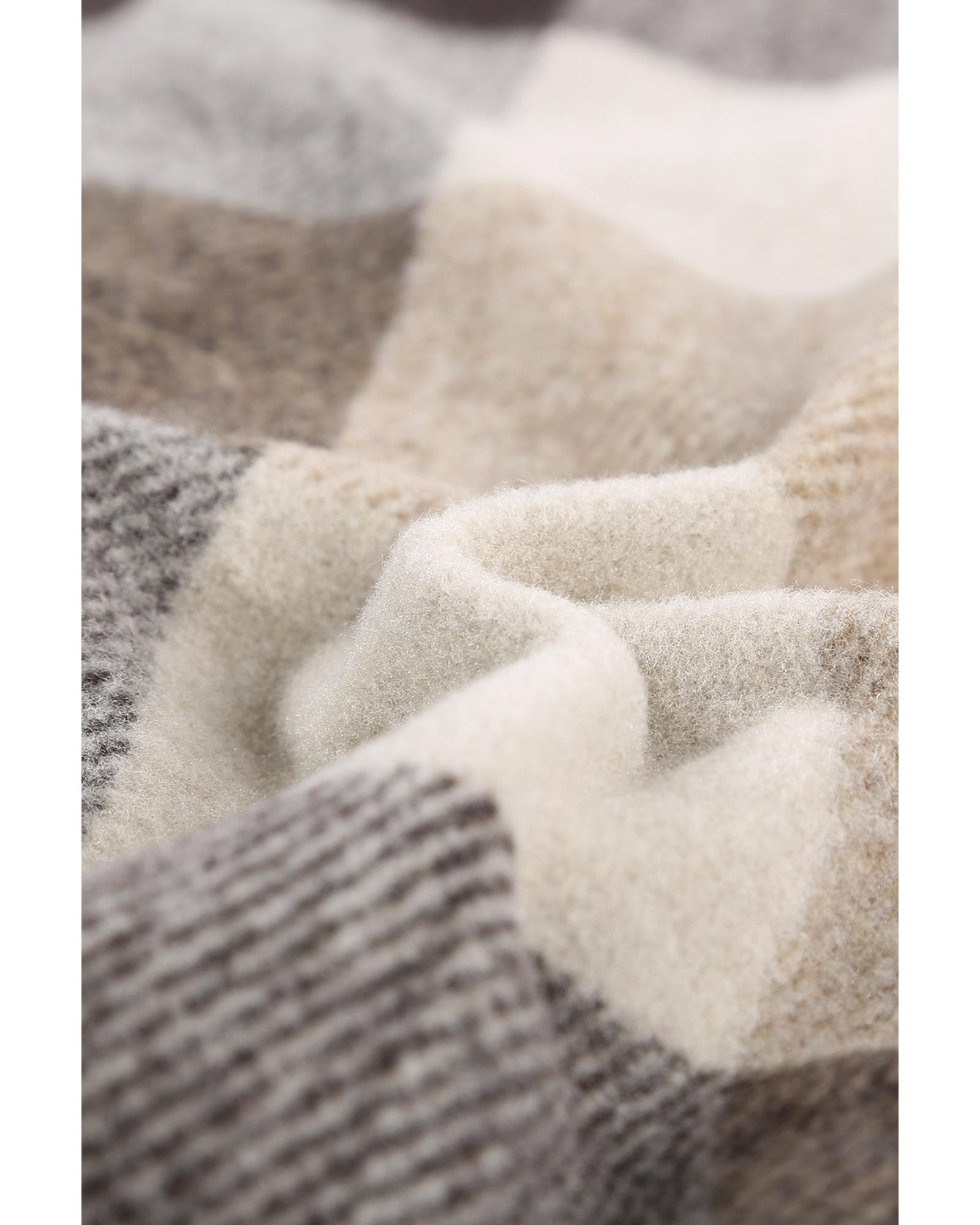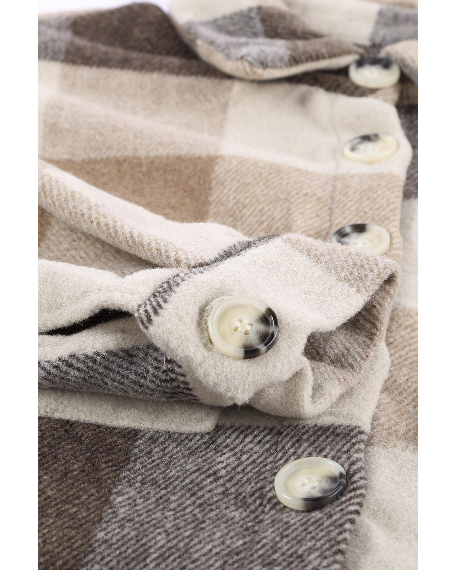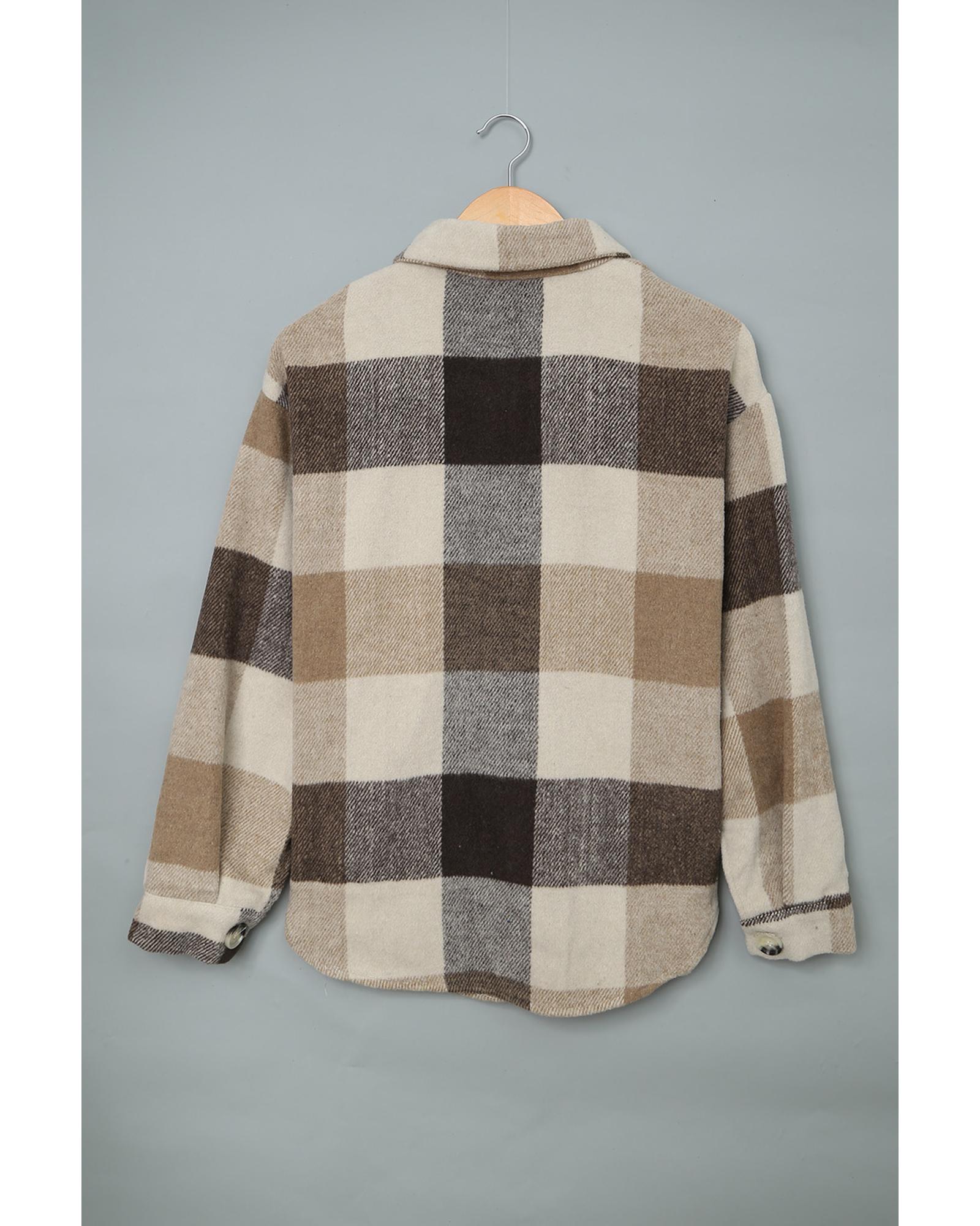 This long sleeve jacket features a stylish khaki plaid color block design with a classic buttoned closure. It is designed to provide warmth and convenience with its long sleeves and a handy pocket for small essentials. Crafted from high-quality materials, this jacket offers durability and a luxurious feel, making it a versatile addition to your wardrobe.