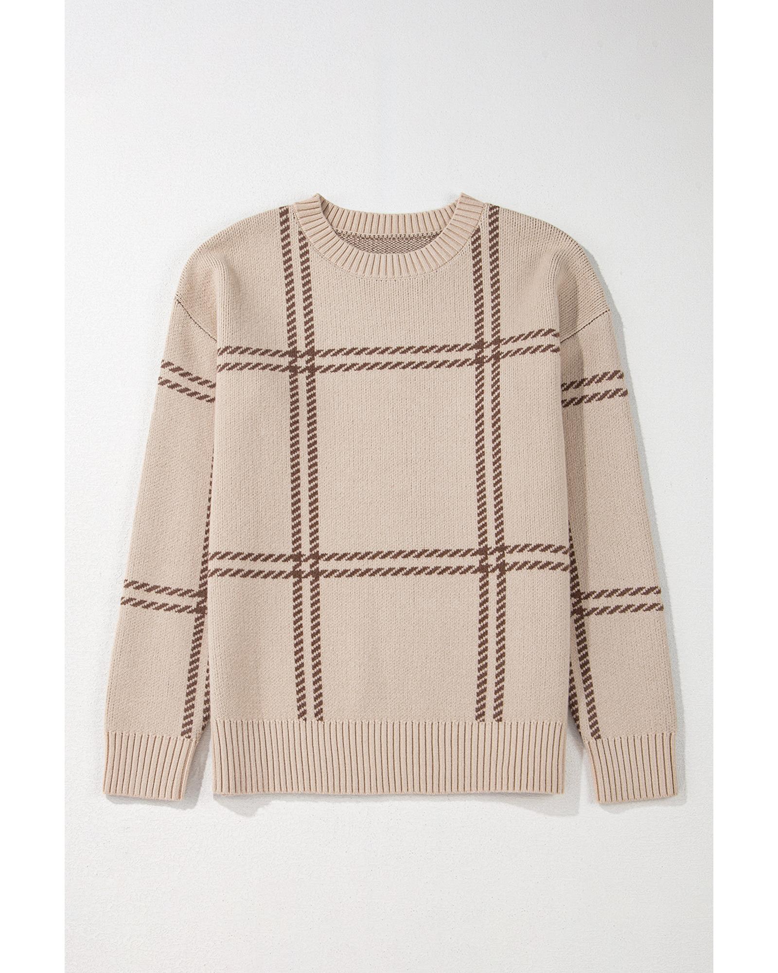 Khaki Plaid Pattern Knitted Drop Shoulder Sweater – L