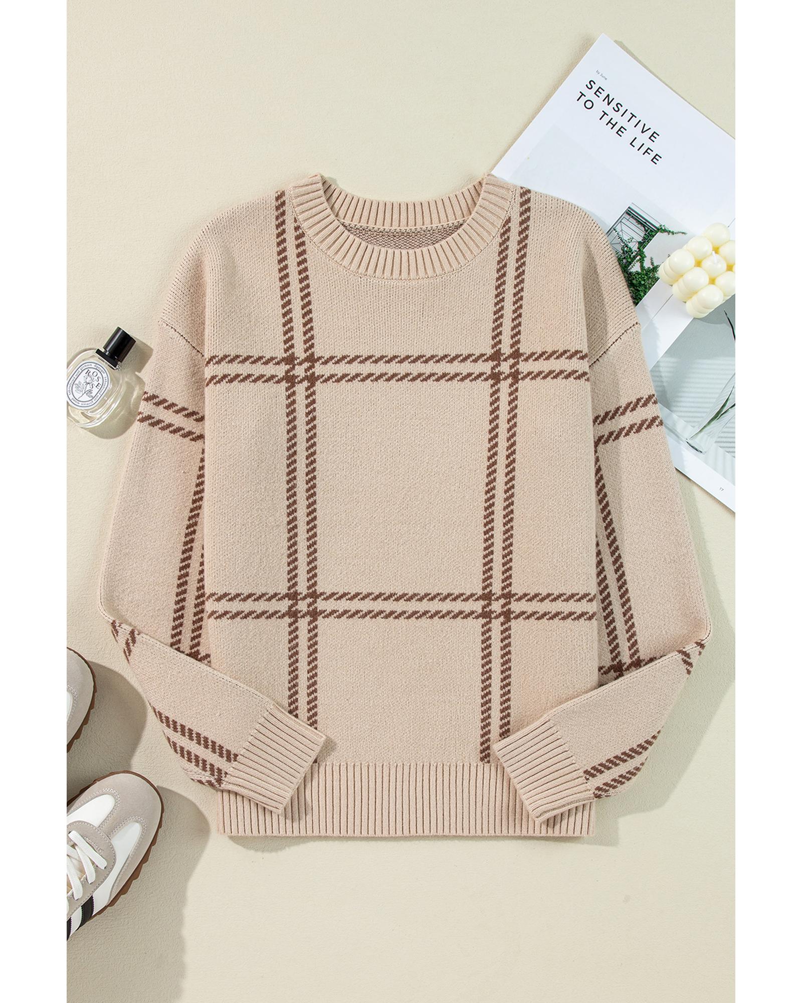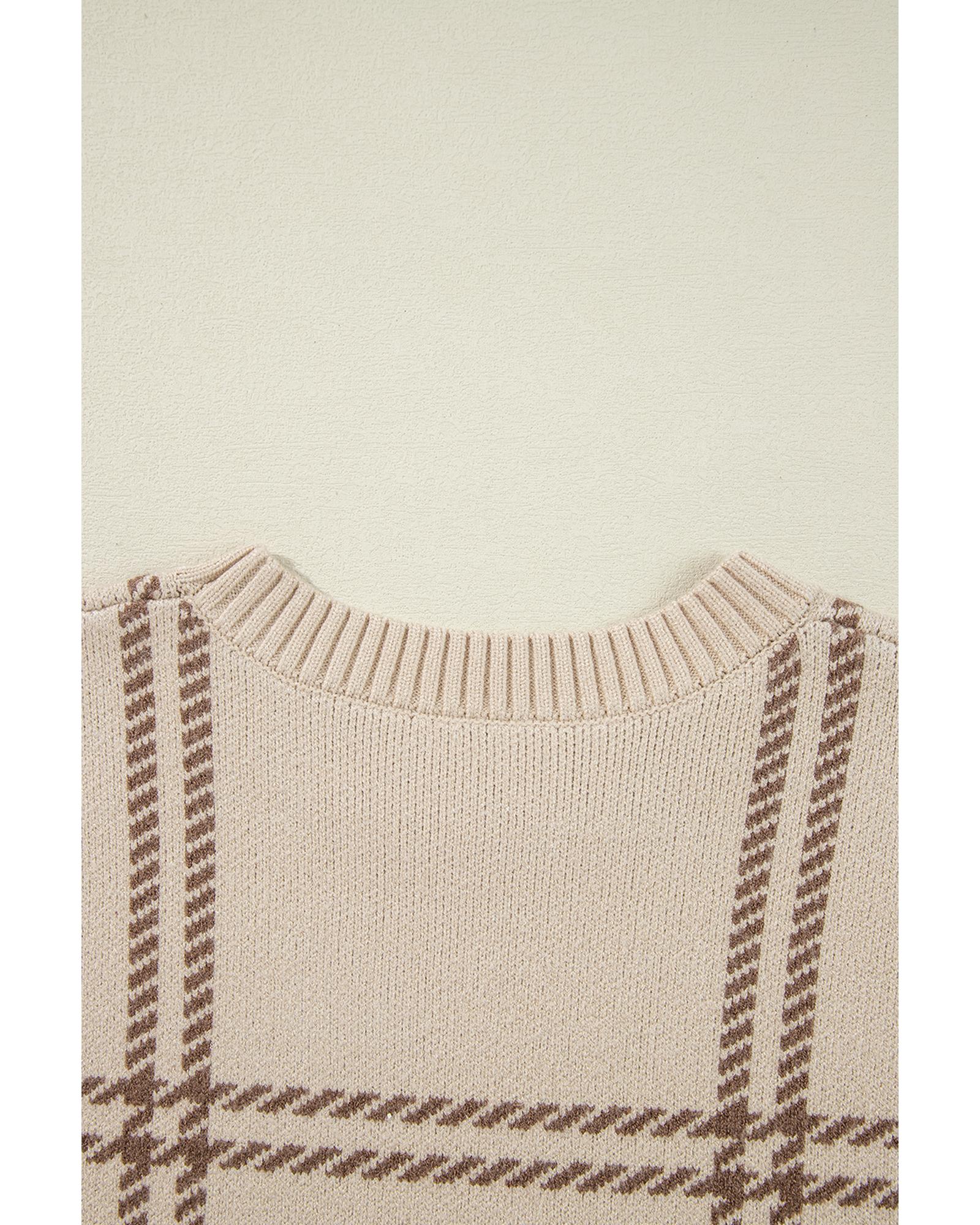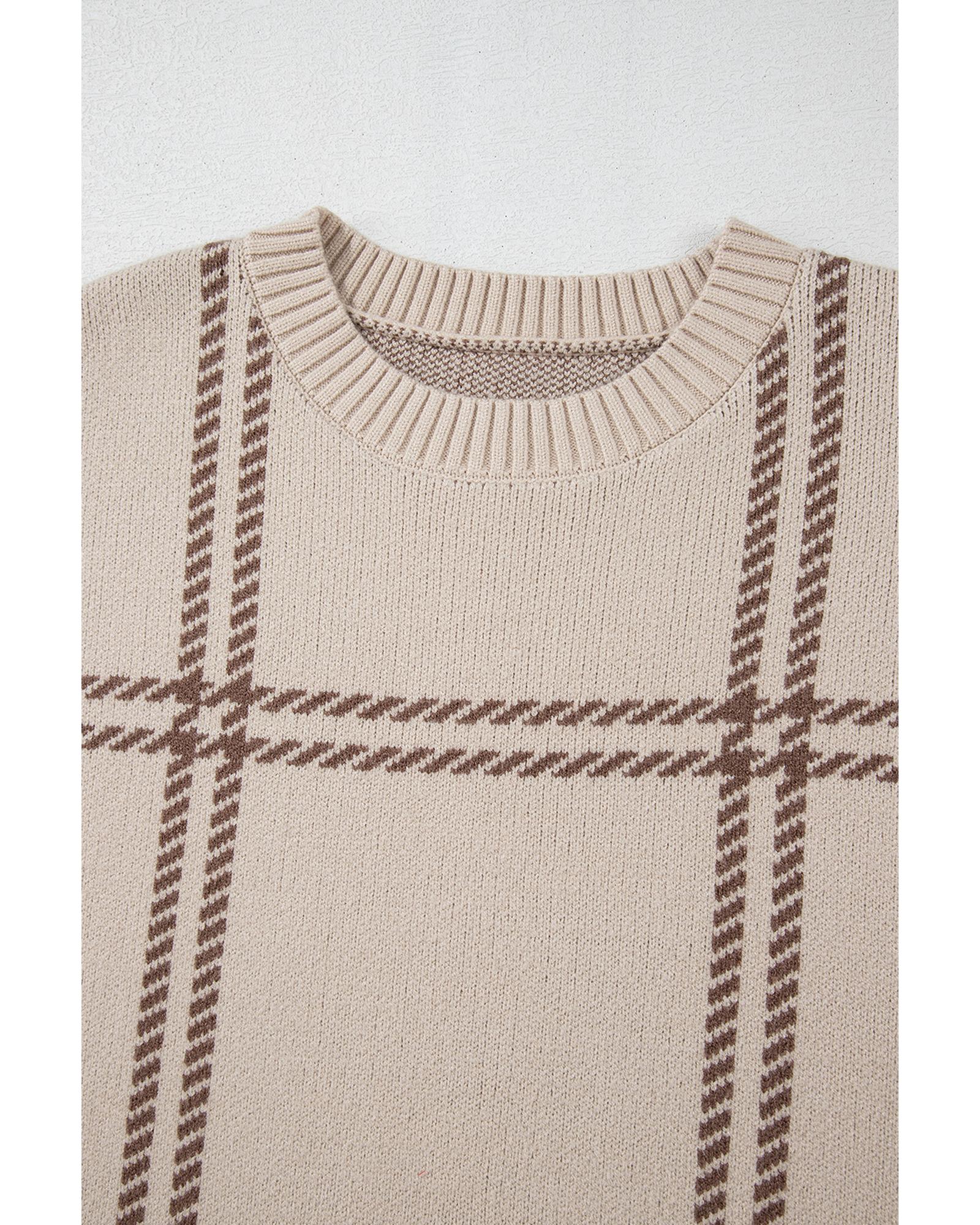 This knitted drop shoulder sweater features a classic plaid pattern, offering a timeless and stylish look. Designed with a crew neck and relaxed silhouette, it combines comfort with a fashionable appearance suitable for various casual occasions.