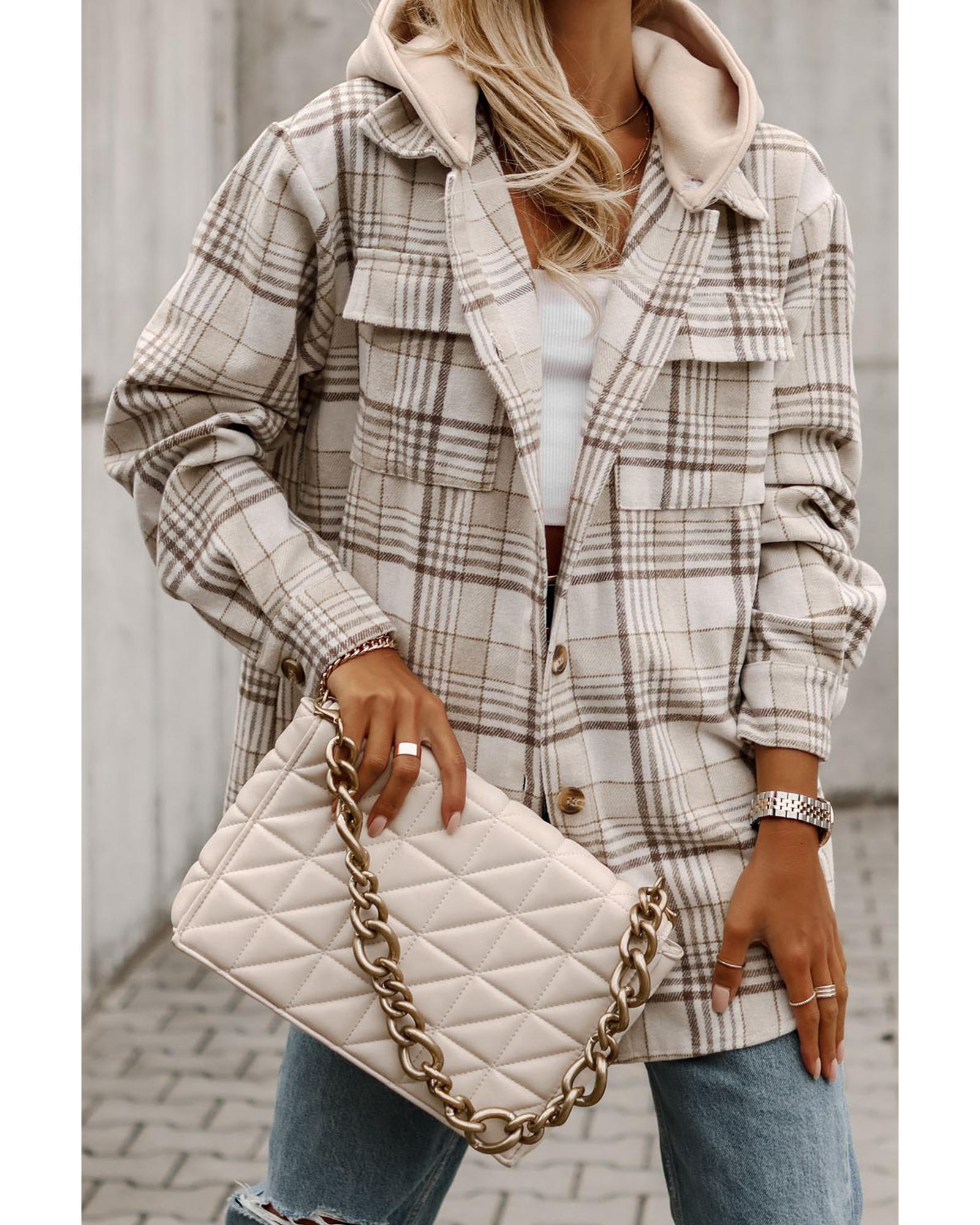 Khaki Plaid Removable Hood Buttoned Shacket – S