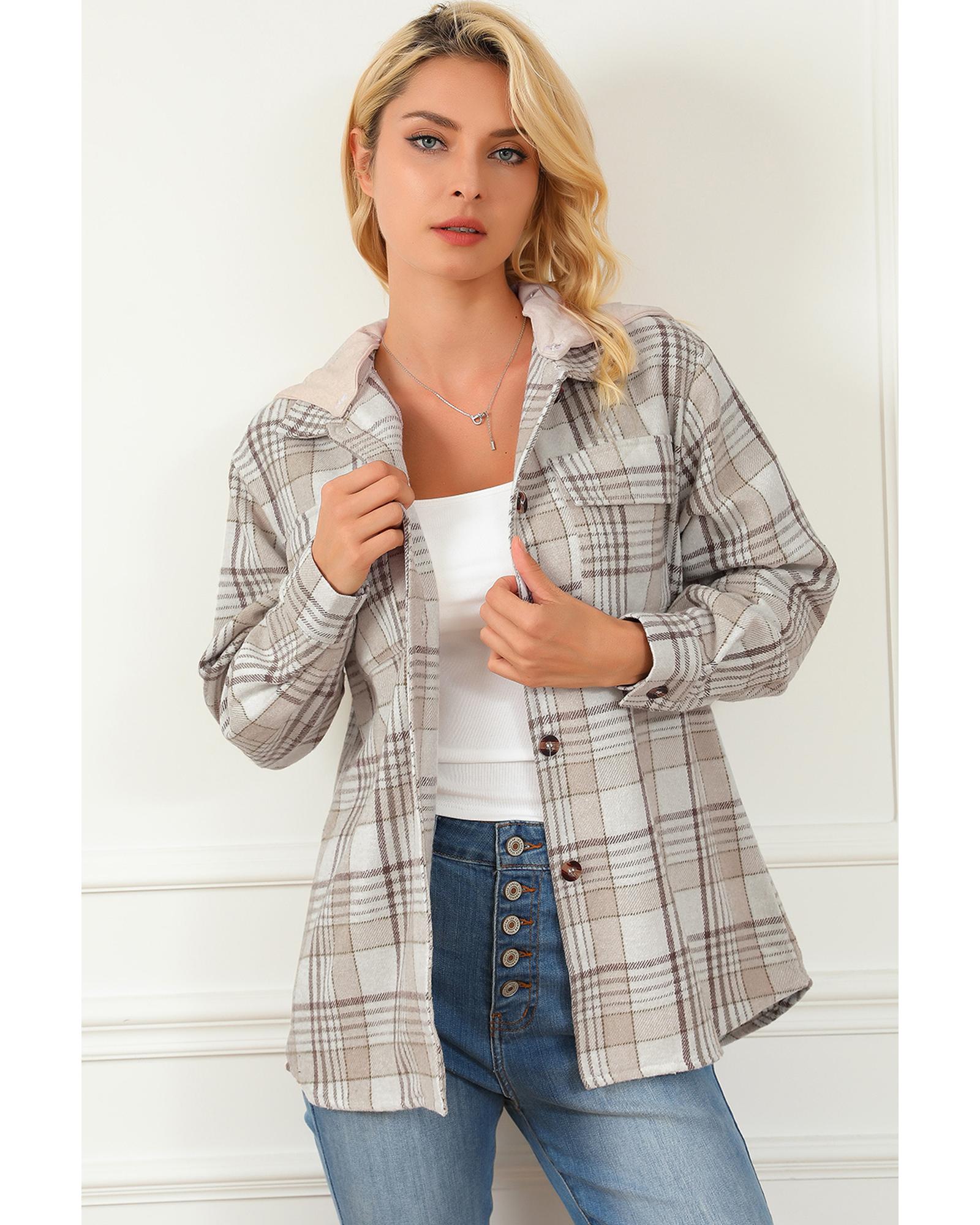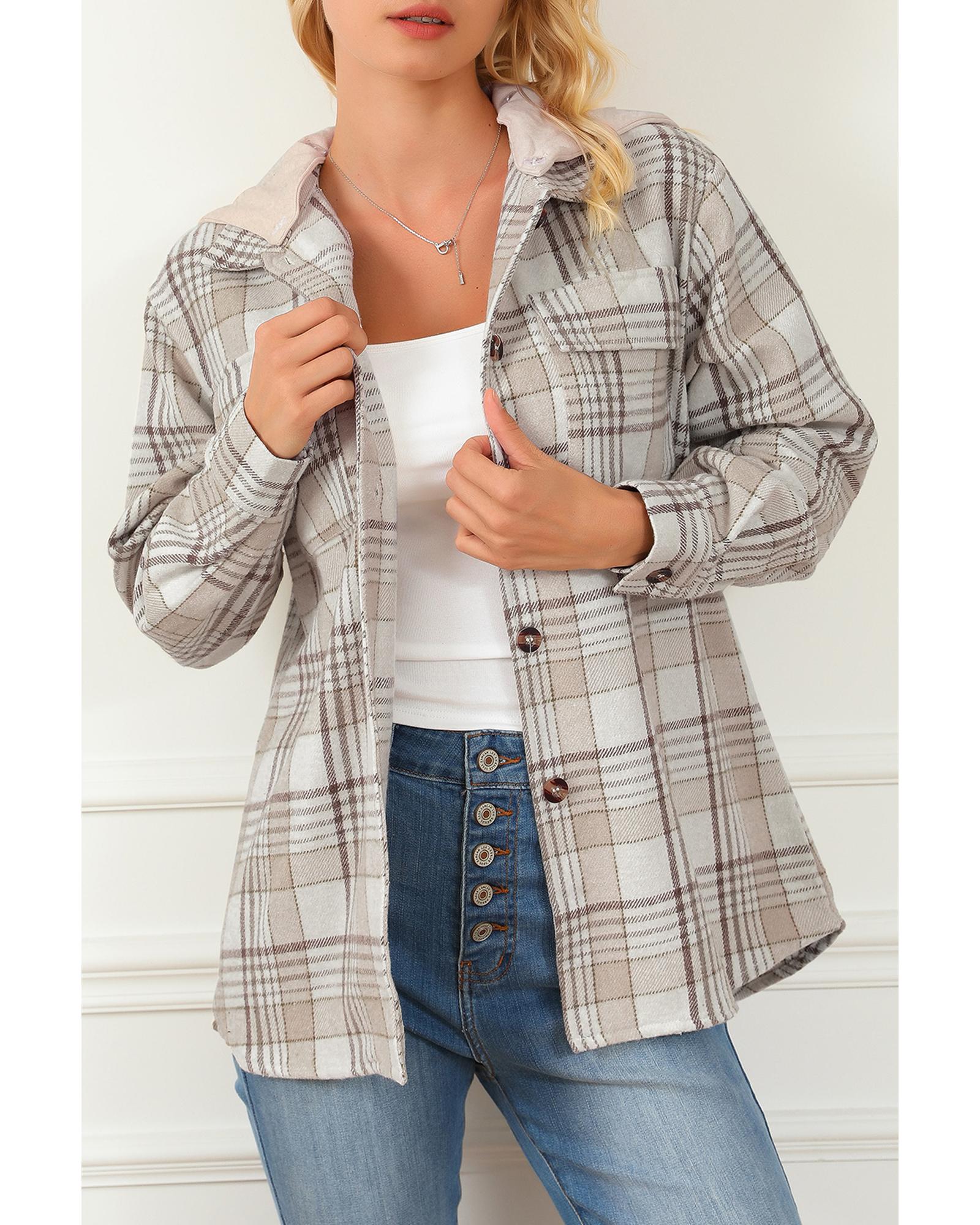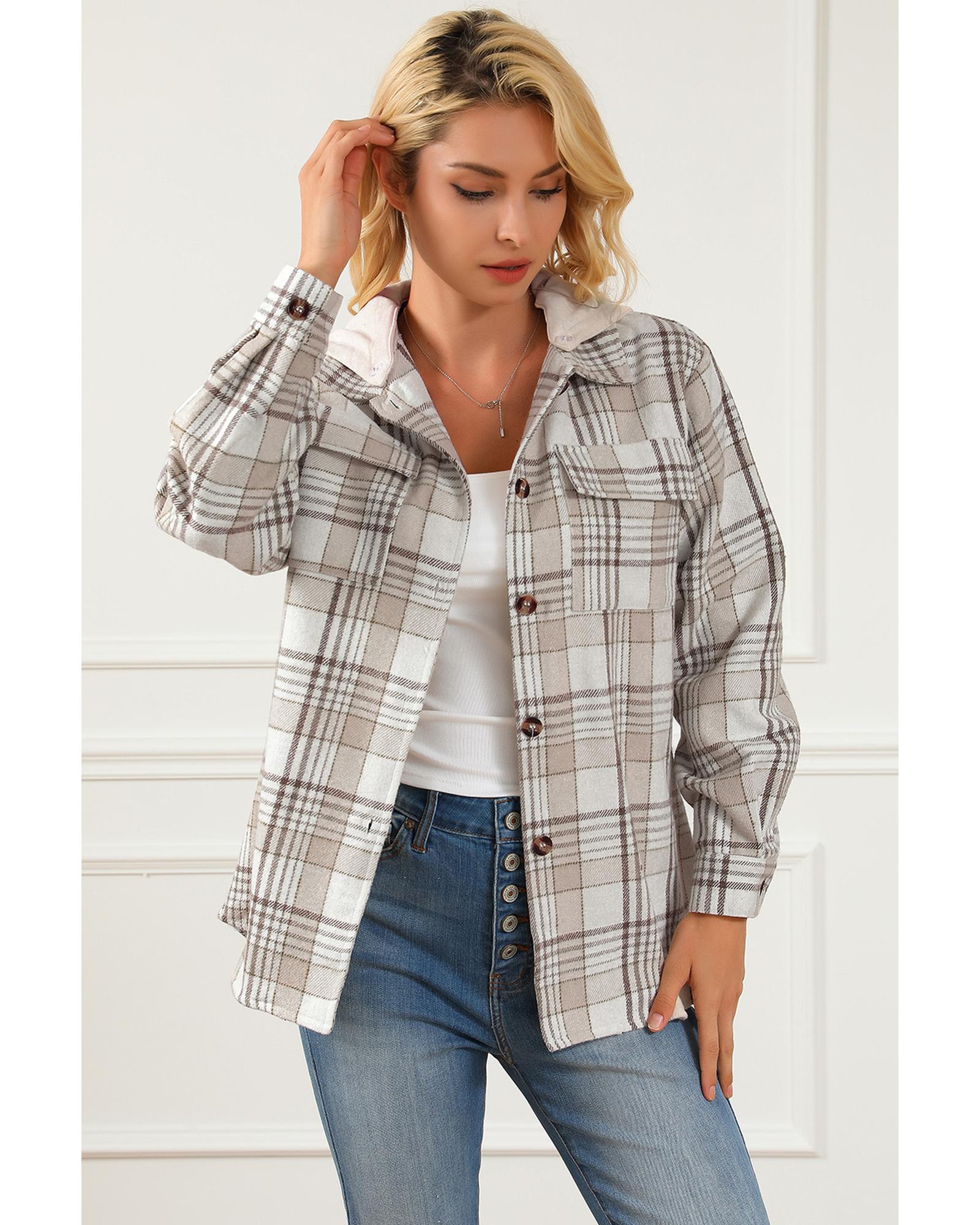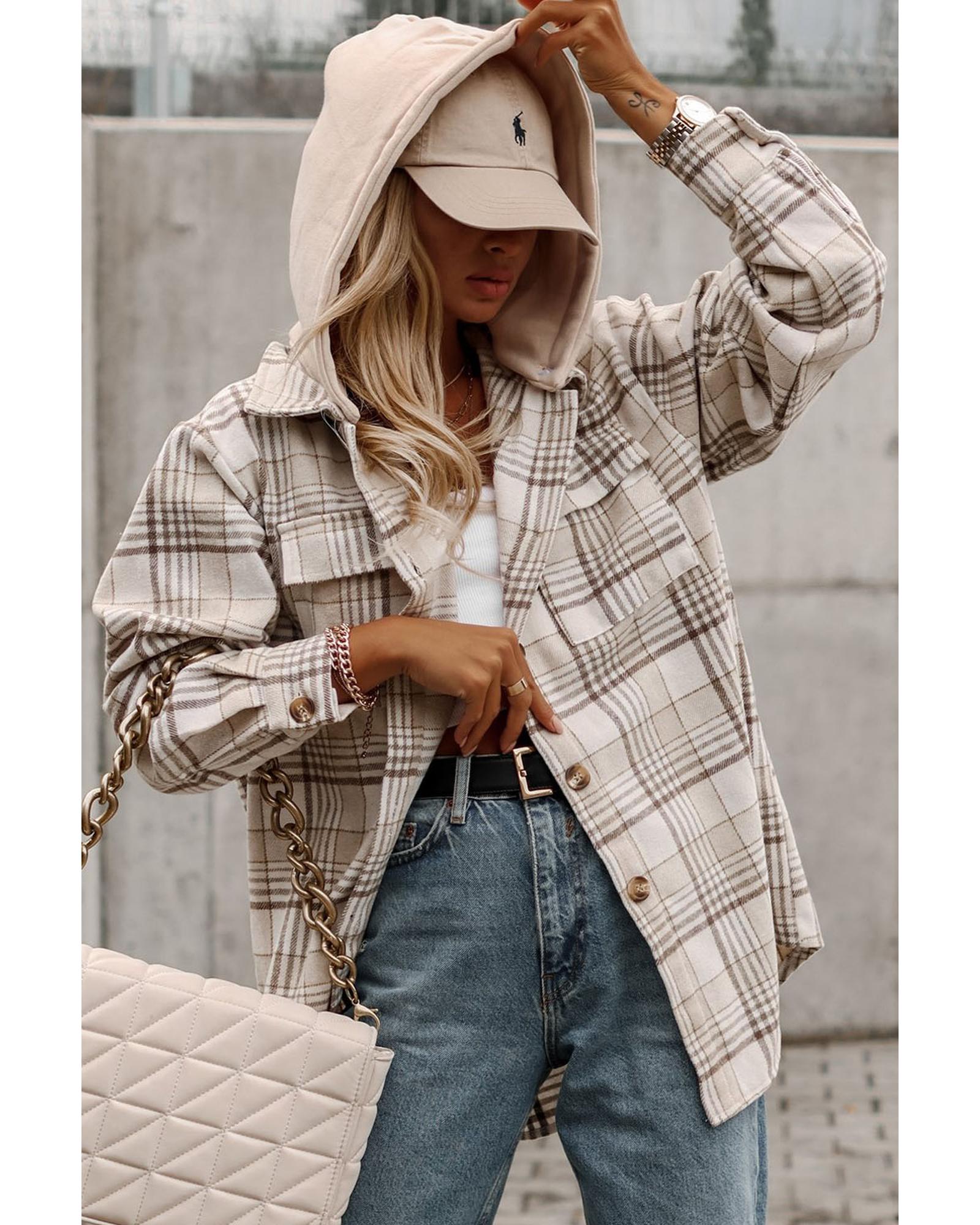 This stylish shacket features a classic plaid pattern with a versatile design that combines the elements of a shirt and a jacket. It is suitable for various casual occasions and offers a trendy, fitted look. The removable hood adds convenience and adaptability to different weather conditions.