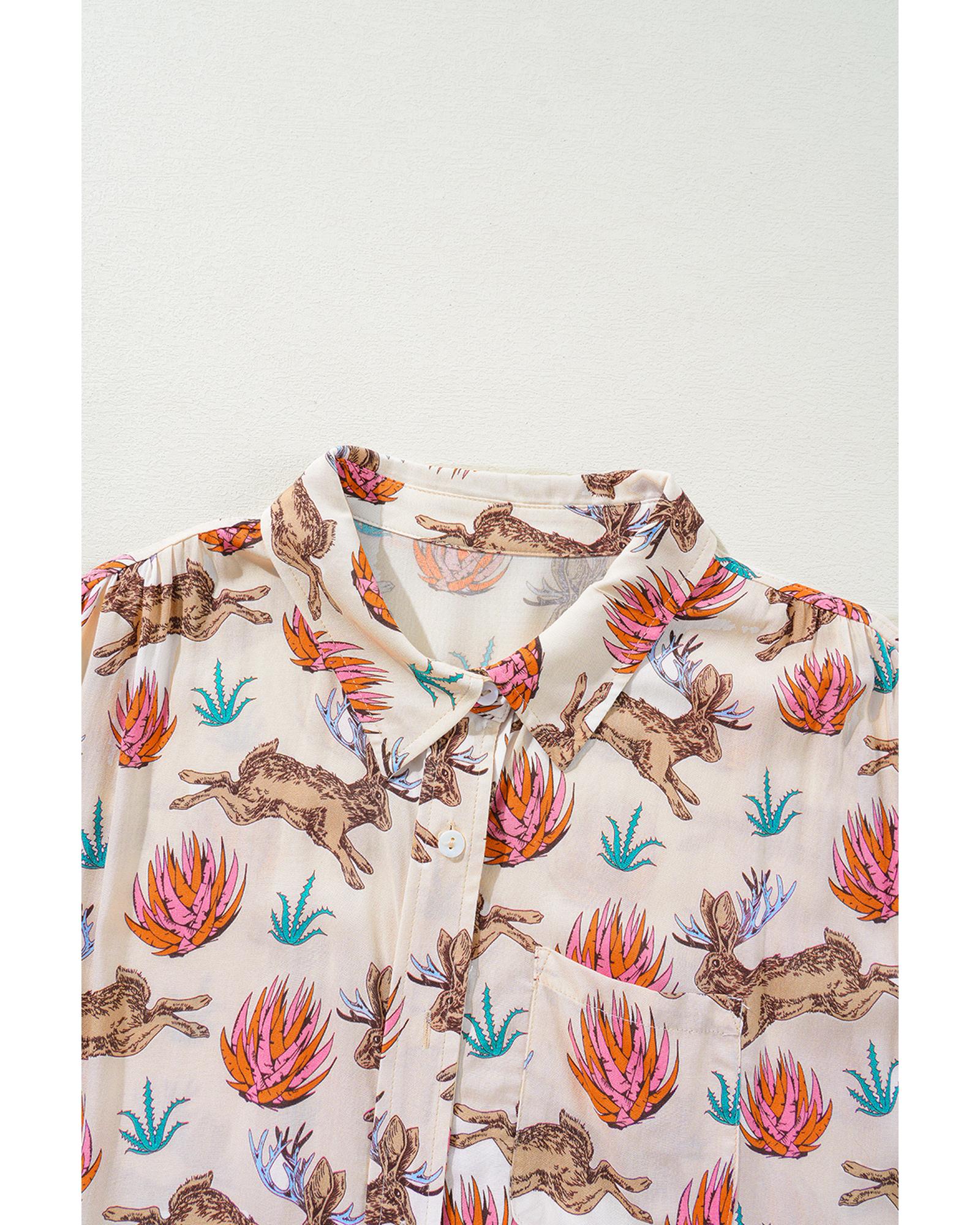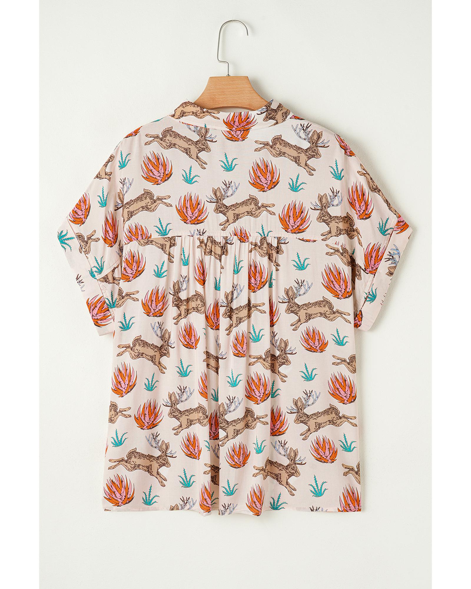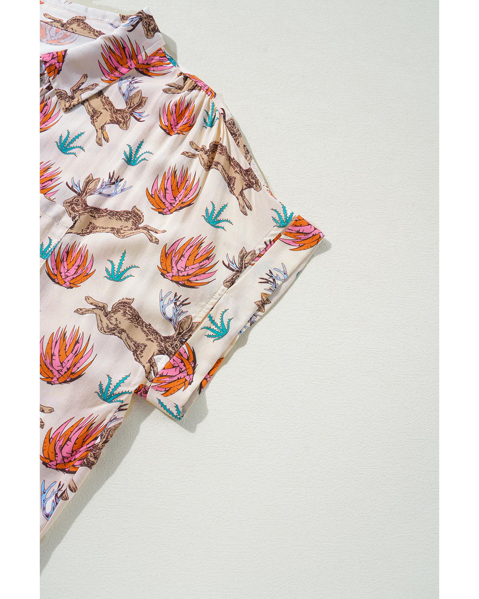 Khaki Plus Size Western Pattern Print Buttoned Short Sleeve Shirt – 2X