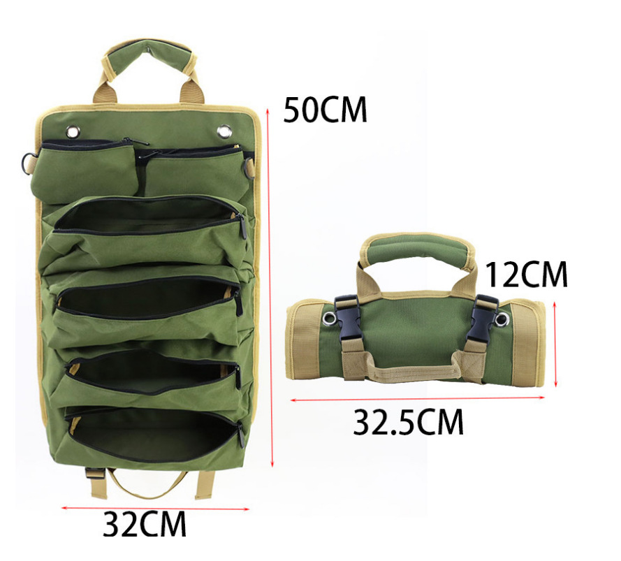 This portable roll-up tool organizer is designed to keep your tools neatly arranged and easily accessible. Its compact and durable construction makes it suitable for both professional and personal use, providing a convenient solution for storing a variety of tools.