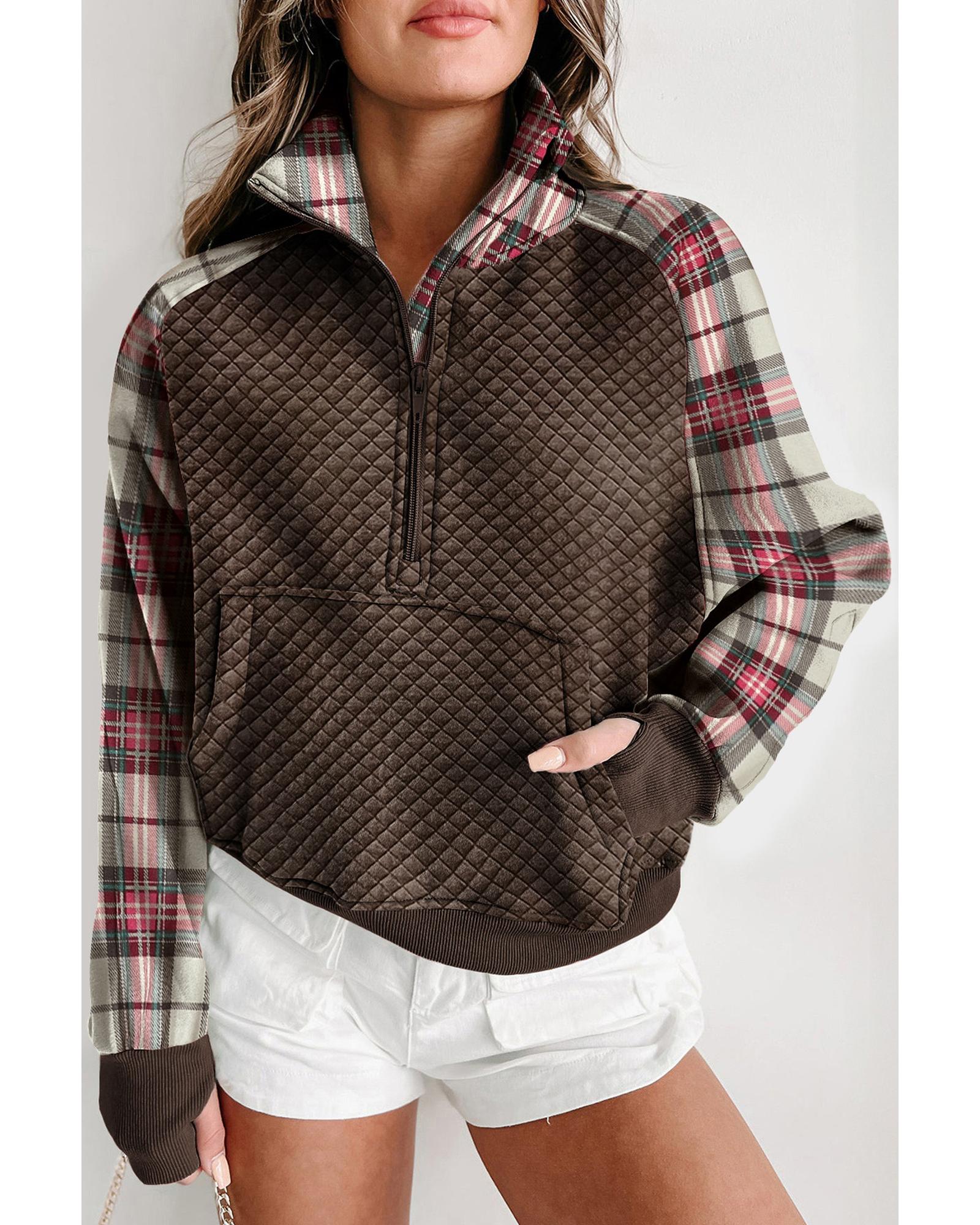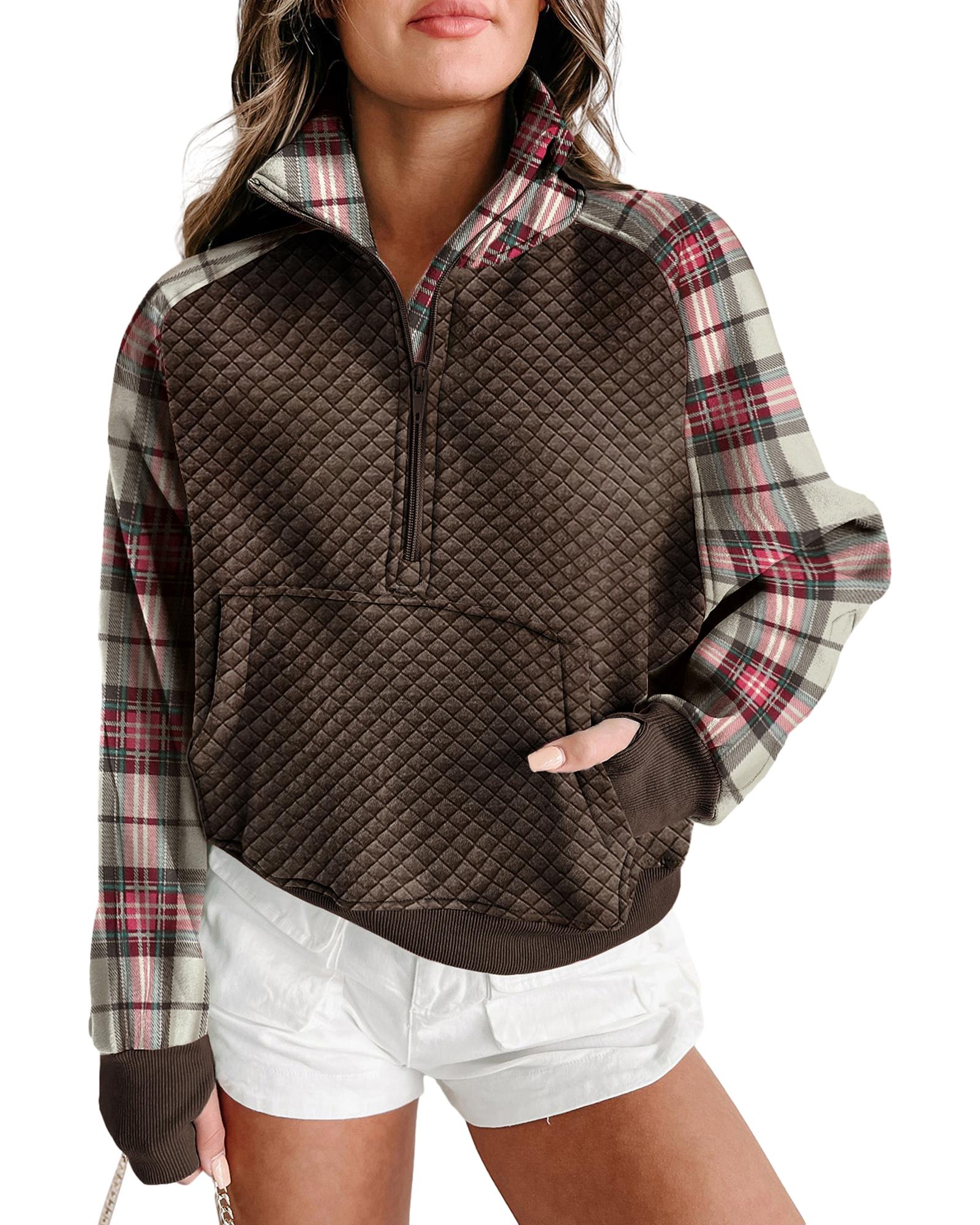 This sweatshirt features a trendy fitted design with a textured fabric and stylish plaid patchwork. It is suitable for casual wear and can be paired easily with jeans, joggers, or sweatpants for a comfortable and fashionable look.
