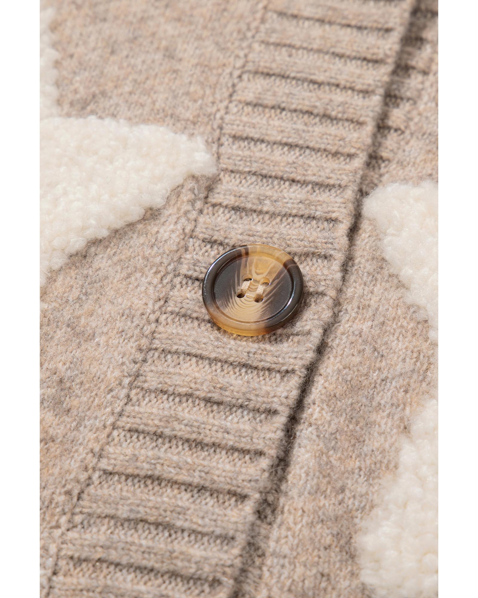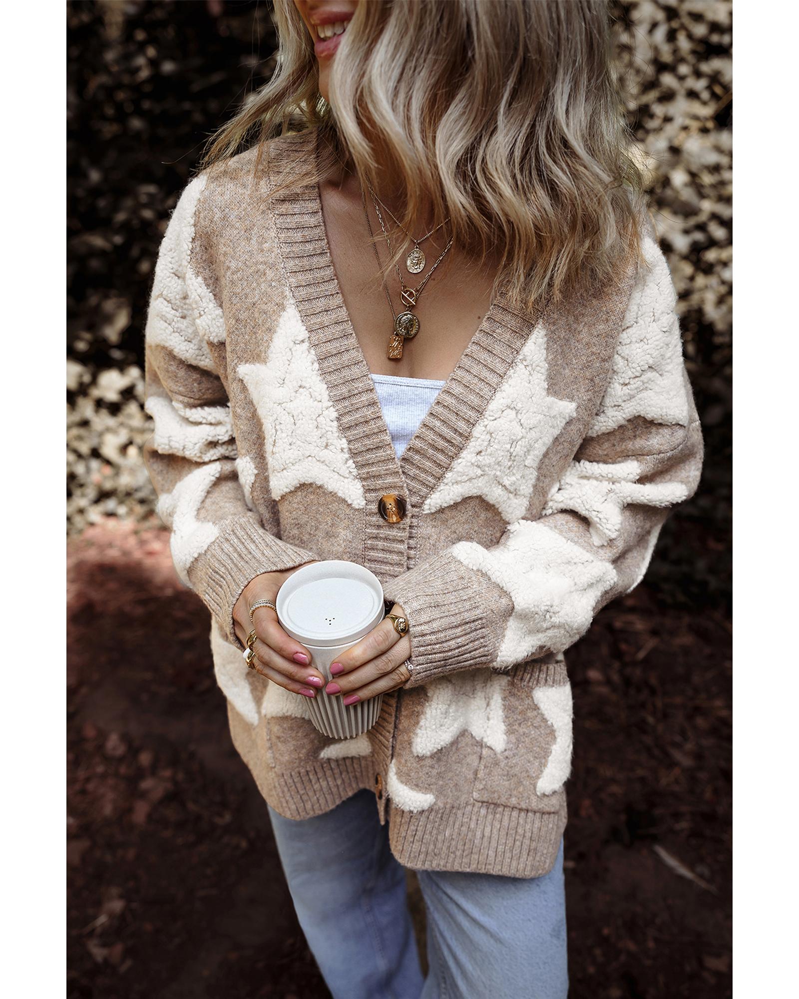 Khaki Sherpa Star Pattern Textured Sweater Cardigan with Pockets – L