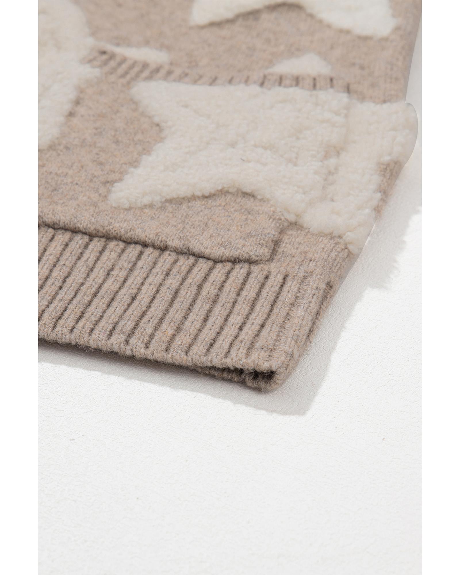 Khaki Sherpa Star Pattern Textured Sweater Cardigan with Pockets – M