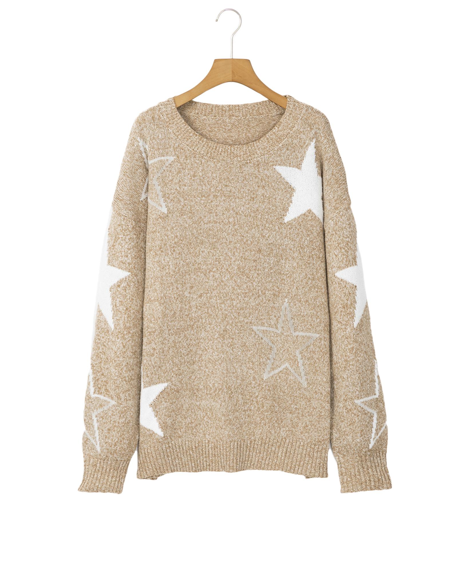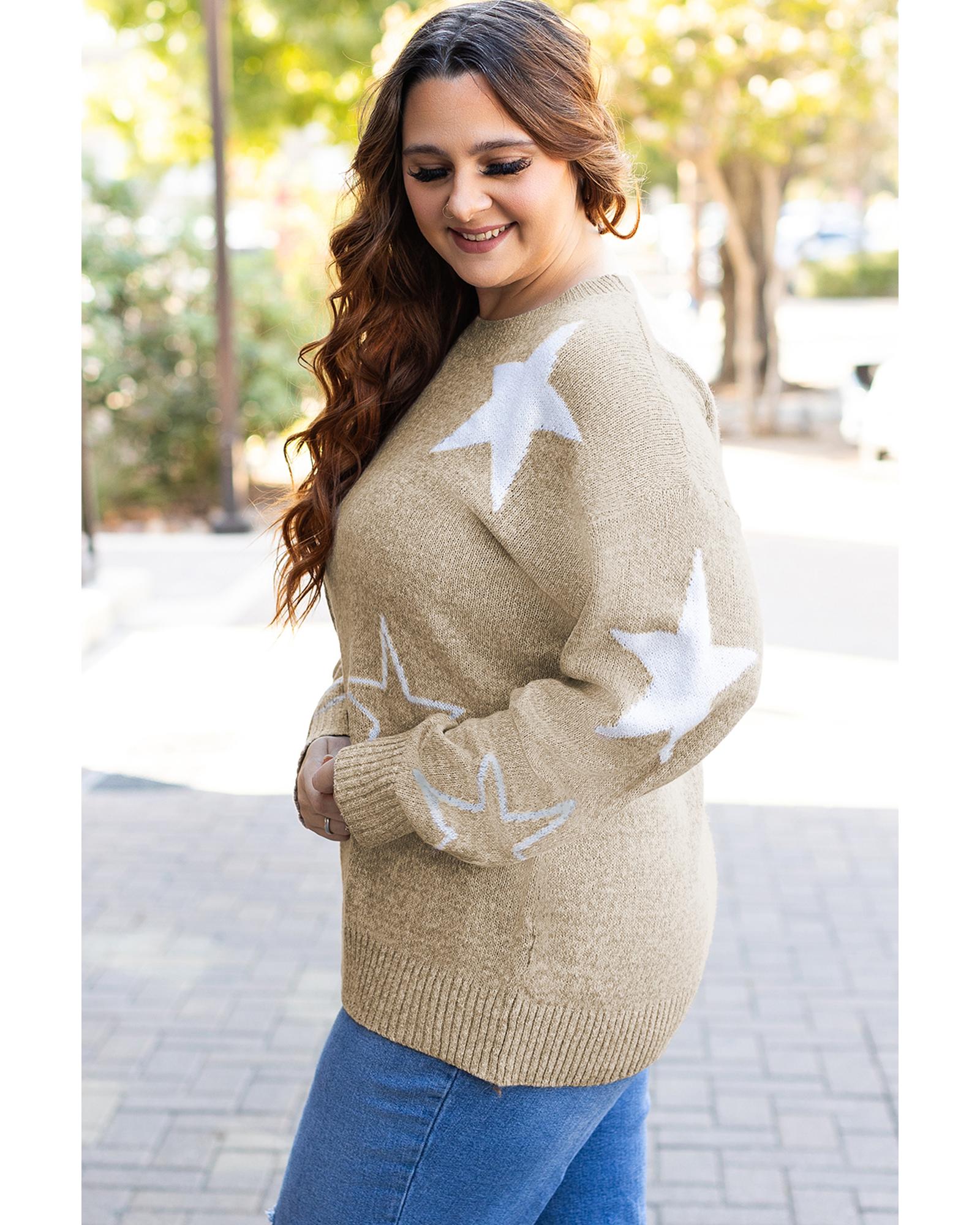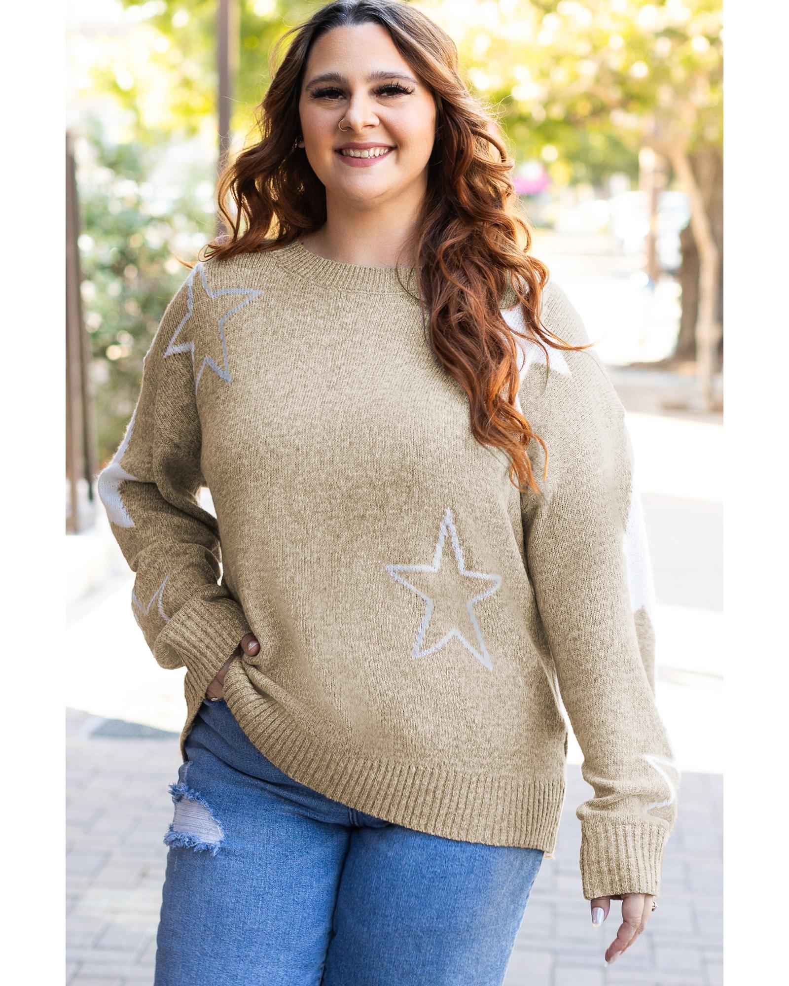 This plus size sweater features a stylish khaki star pattern with a relaxed drop shoulder design. It offers a comfortable, loose fit that flatters various body shapes, making it a versatile addition to your wardrobe. Crafted from high-elasticity knit fabric, it combines comfort with a trendy look.