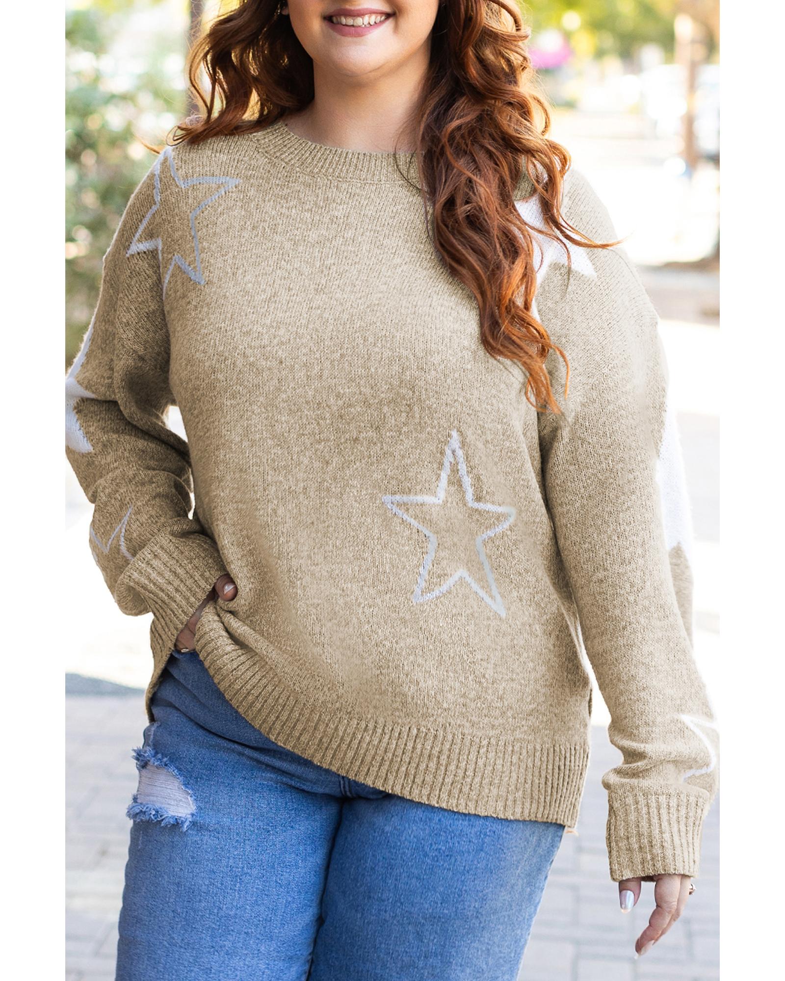 Khaki Star Pattern Drop Shoulder Plus Size Sweater – 3X