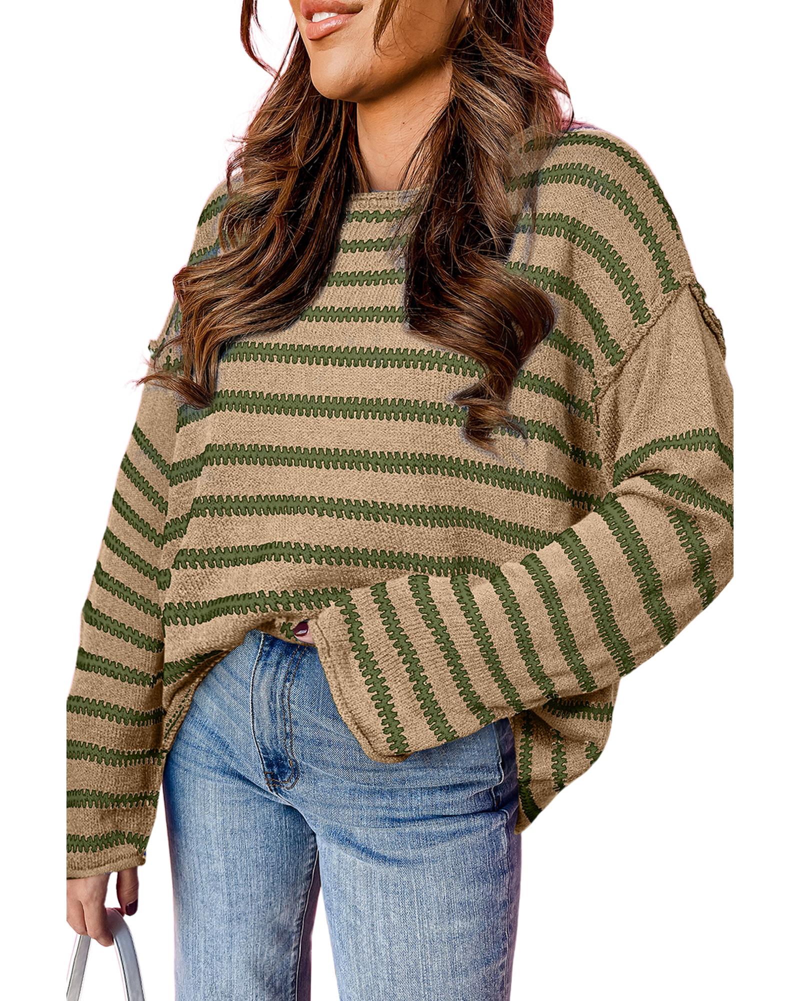 This casual sweater features a stylish khaki color with a white striped pattern, designed for a relaxed and trendy look. It offers a loose fit with a drop shoulder design, making it comfortable and chic for everyday wear. Crafted from soft, warm, and breathable acrylic material, it ensures comfort and skin-friendliness.