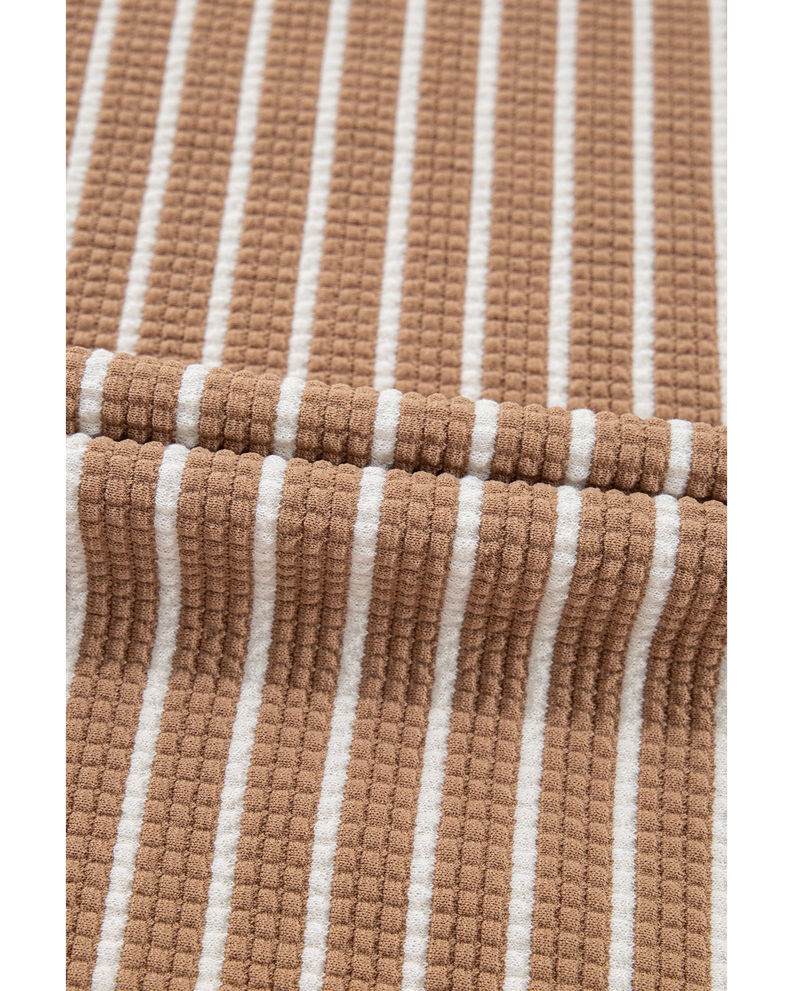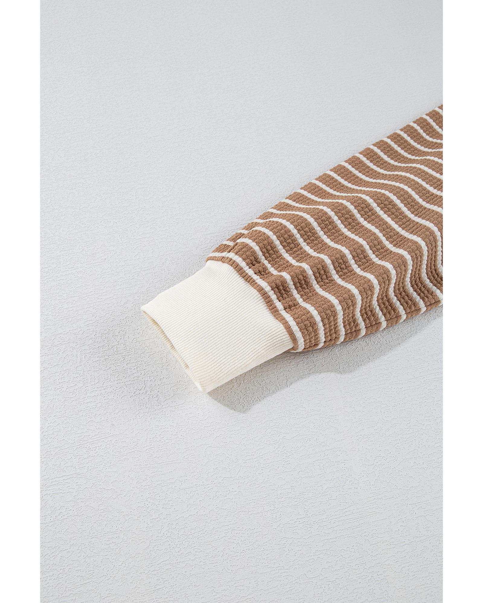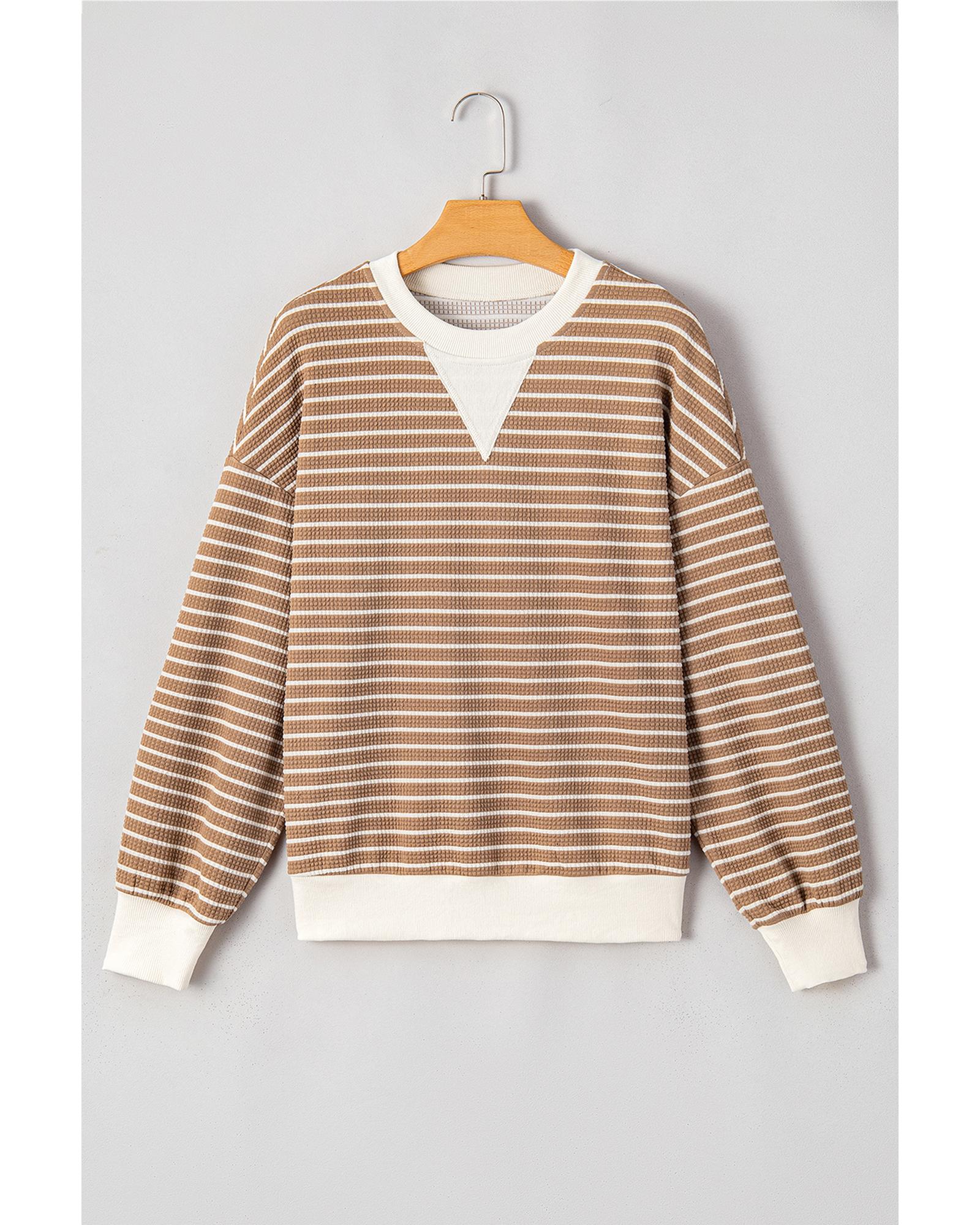 Khaki Stripe Patched Edge Textured Round Neck Long Sleeve Top – XL